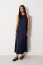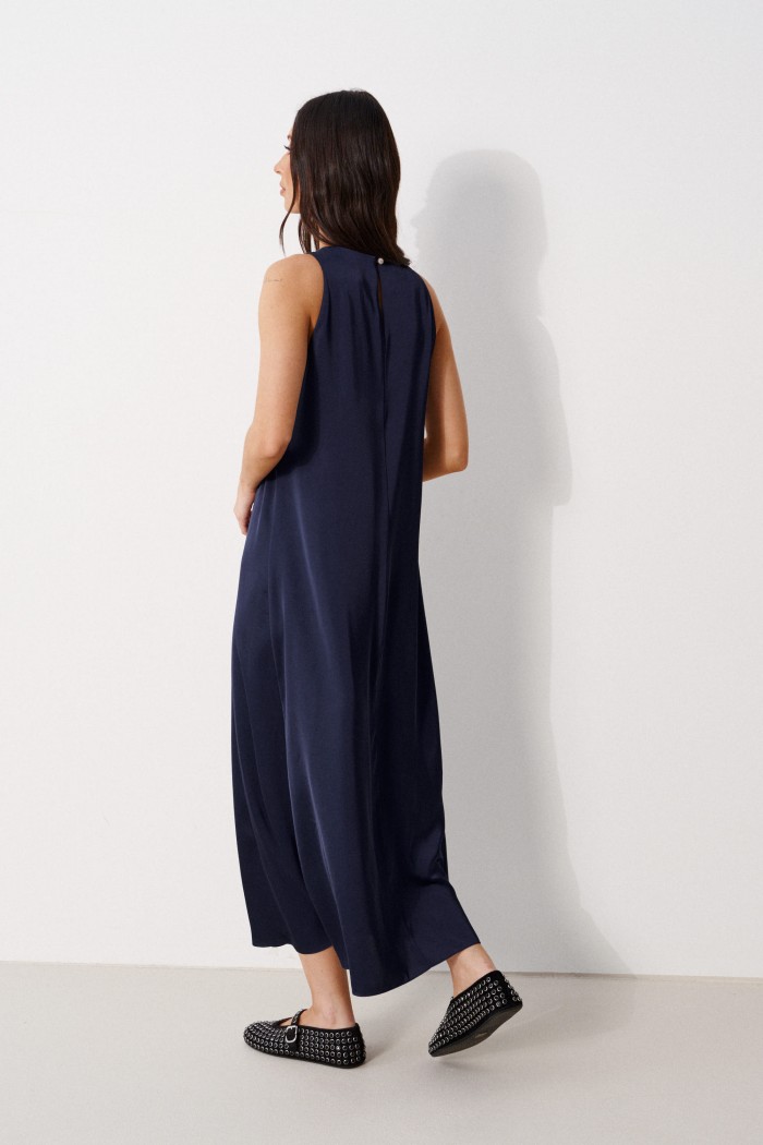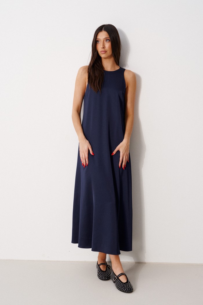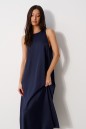 Платье-миди А-силуэта. Выполнено из мягкой струящейся ткани синего цвета. Без подкладки. Вырез горловины круглый. Застёжка в центральном шве заднего полотна пуговка. Длина спинки 124 см