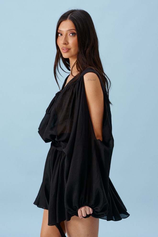 Платье-мини выполнено из текстильного полотна черного цвета. Характеристика: подьюбник, на талии резинка, v-образный вырез, рукава Элетучая мышь", вырезы по верху рукава, на поясе. Длина изделия по спинке 88 см.