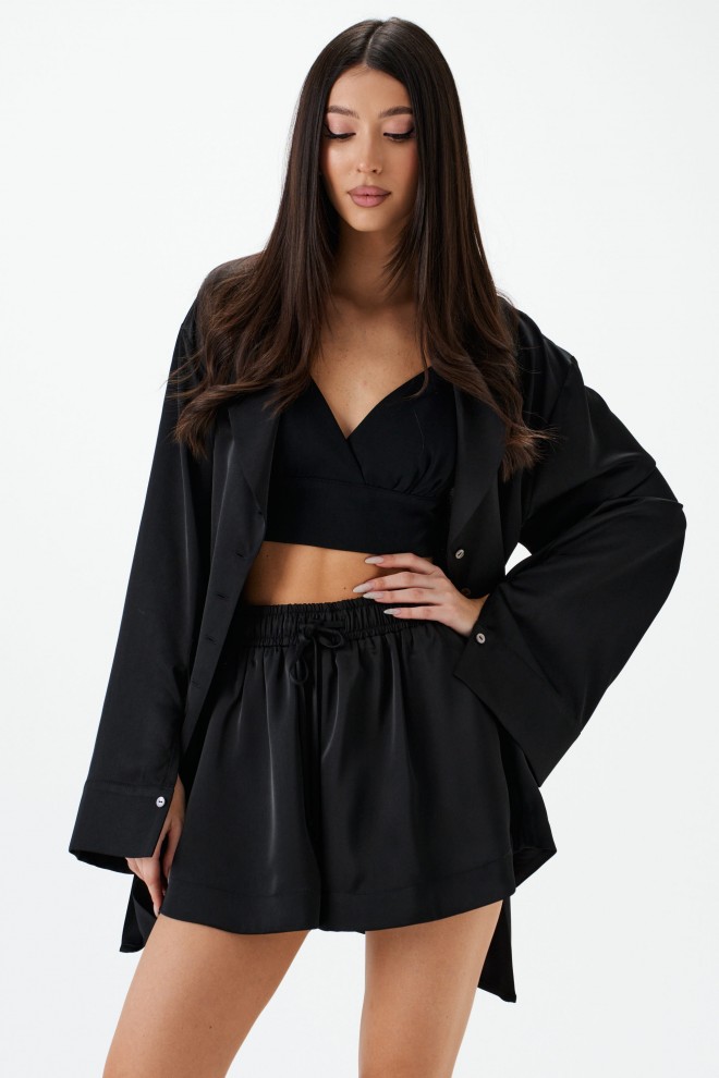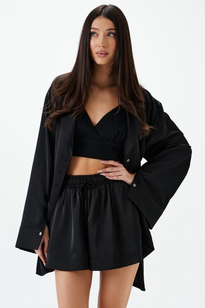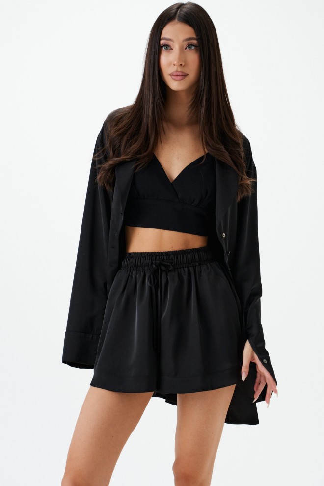 Шорты выполненные из струящегося полотна черного цвета. Характеристики: широкие, короткие, пояс притачной, присборен на резинку. Имеет две отделочные строчки по краям, образующие кулису, в которую продет шнур-завязка. В боковых швах карманы с отрезным бочком. Низ обработан в подгибку с закрытым срезом. Длина 32 см