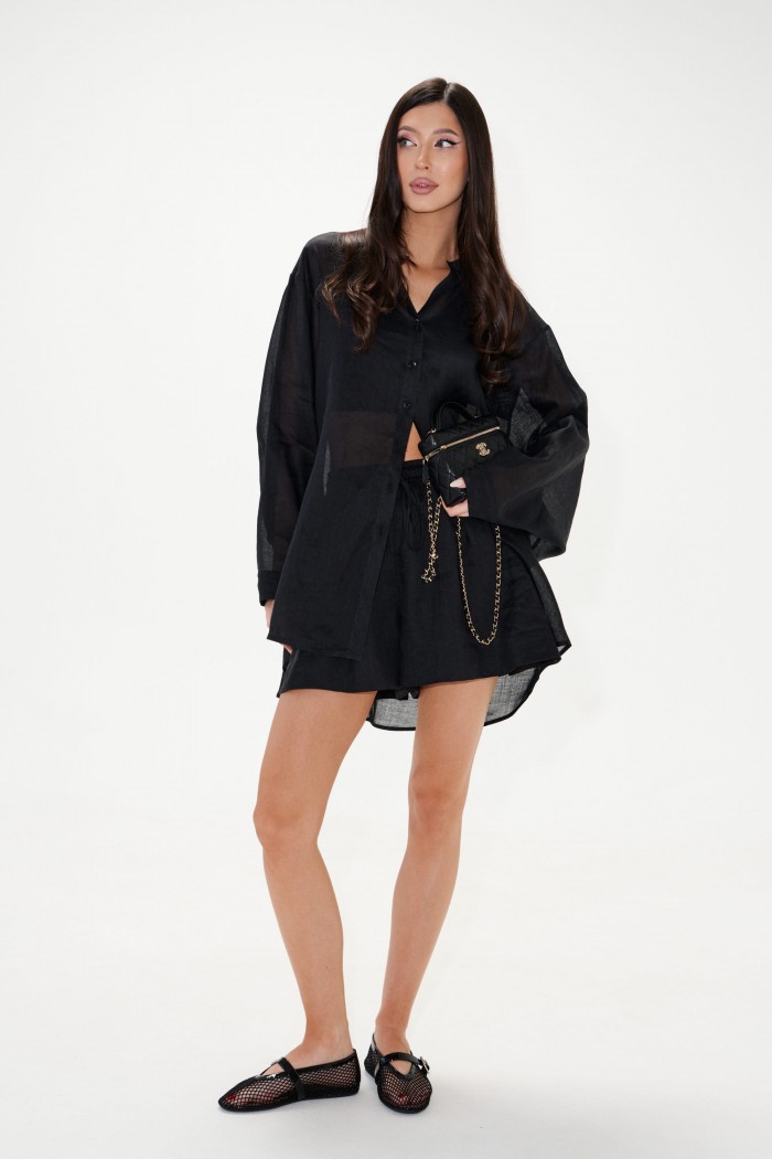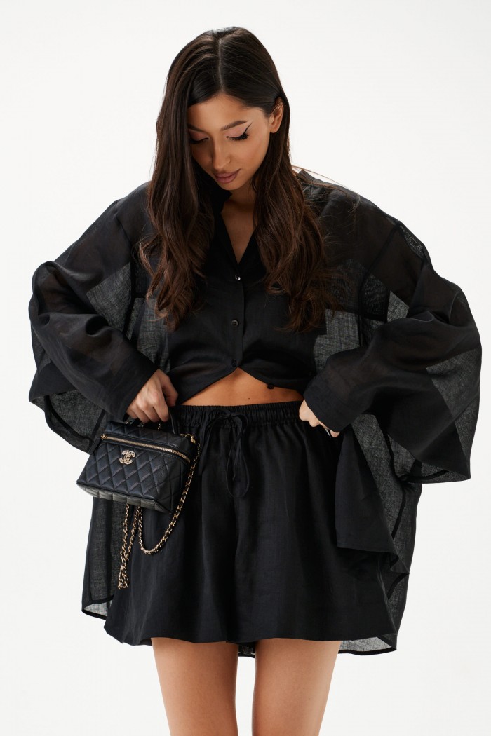 Шорты свободного кроя. Выполнены из лёгкого натурального полотна – рами. Пояс на резинке с завязками. В боковых швах карманы. Есть подкладка. Длина 40 см