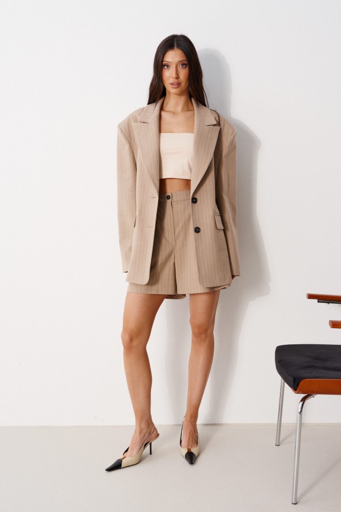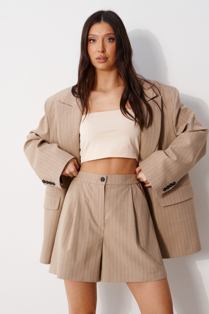 Шорты свободного кроя выполнены из плотной ткани в полоску.