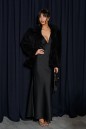 Шубка приталенного силуэта, выполнена из полотна с длинным черным ворсом. Характеристика: прилаталенный силуэт, расклешенный низ. Воротник стойка, рукав втачной, застежка центарльная на потойные крючки. В боковых швах карманы. Подкладка с утеплением. Длина по спинке от края горловины 63см, длина рукава 64см.
