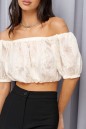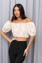 Топ с полуоткрытыми плечами выполнен из хлопкового молочного полотна с вышивкой. Характеристики: полуоткрытые плечи, прямой вырез горловины, рукав спущен, верх и низ рукава на резинке, верх и низ изделия на резинке. Длина изделия 29 см, длина рукава 28см.