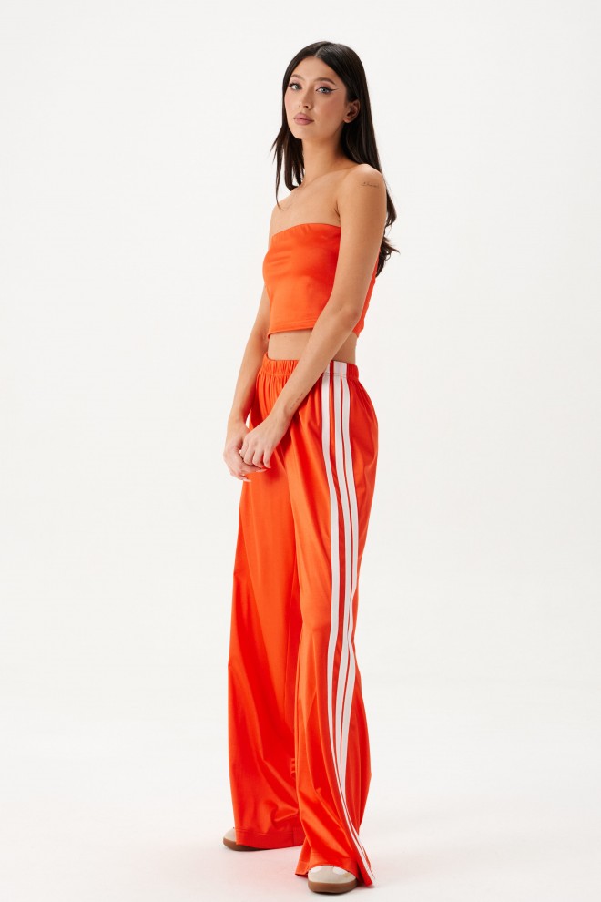 Укороченный топ прямого кроя выполнен из трикотажа ярко-оранжевого цвета.