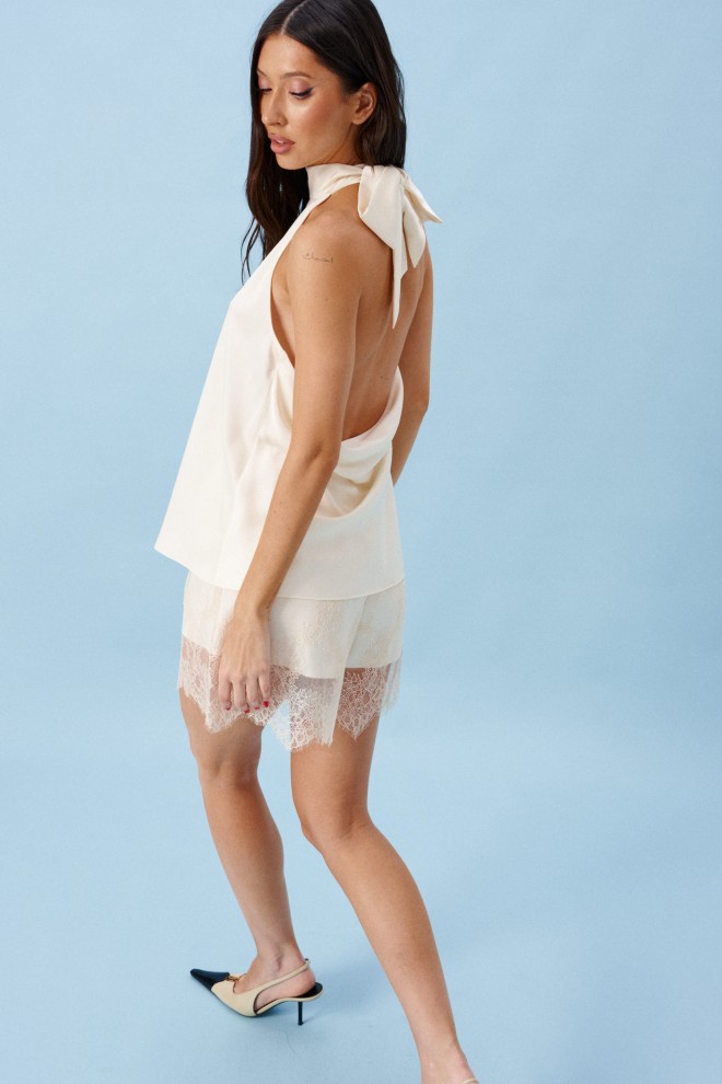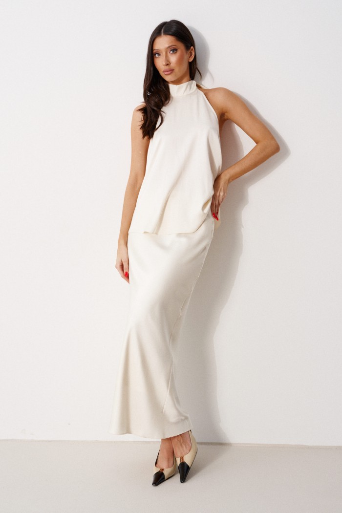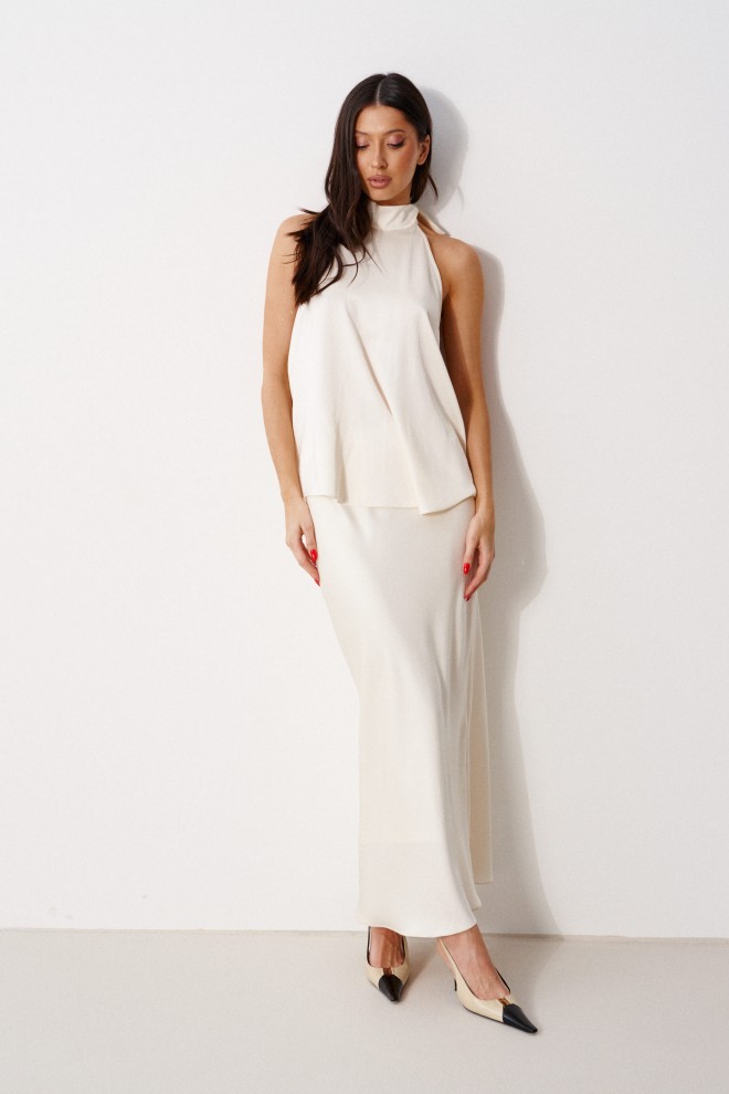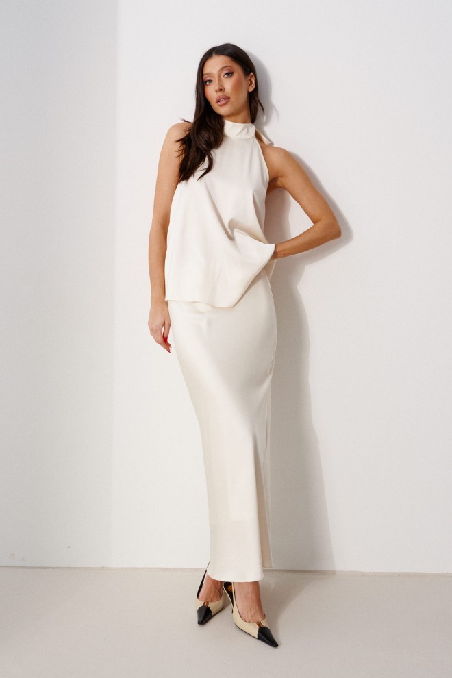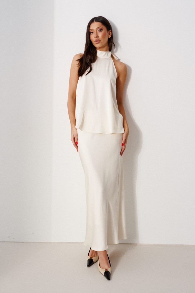 Блуза А-силуэта. Выполнена из лёгкого струящегося полотна кремового цвета. Горловина – стойка-лента, формирующаяй бант сзади. По спинке верхняя часть с вырезом-качелью. Длина по боковому шву 38 см