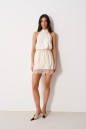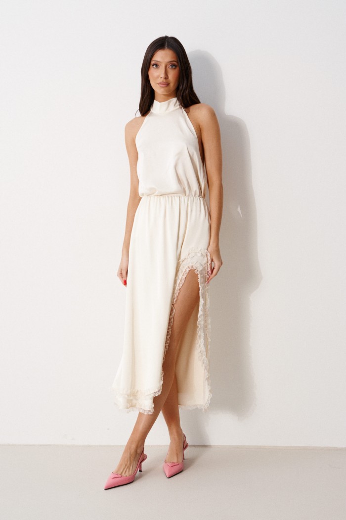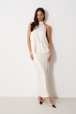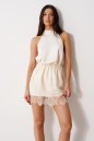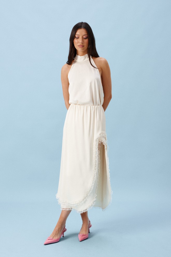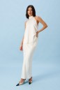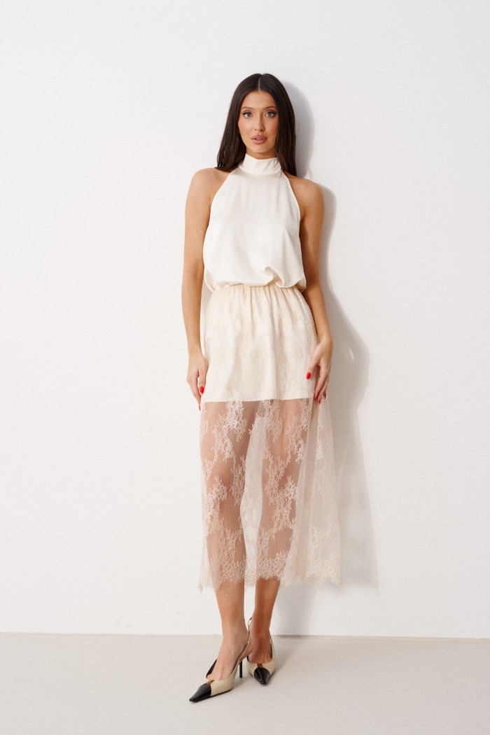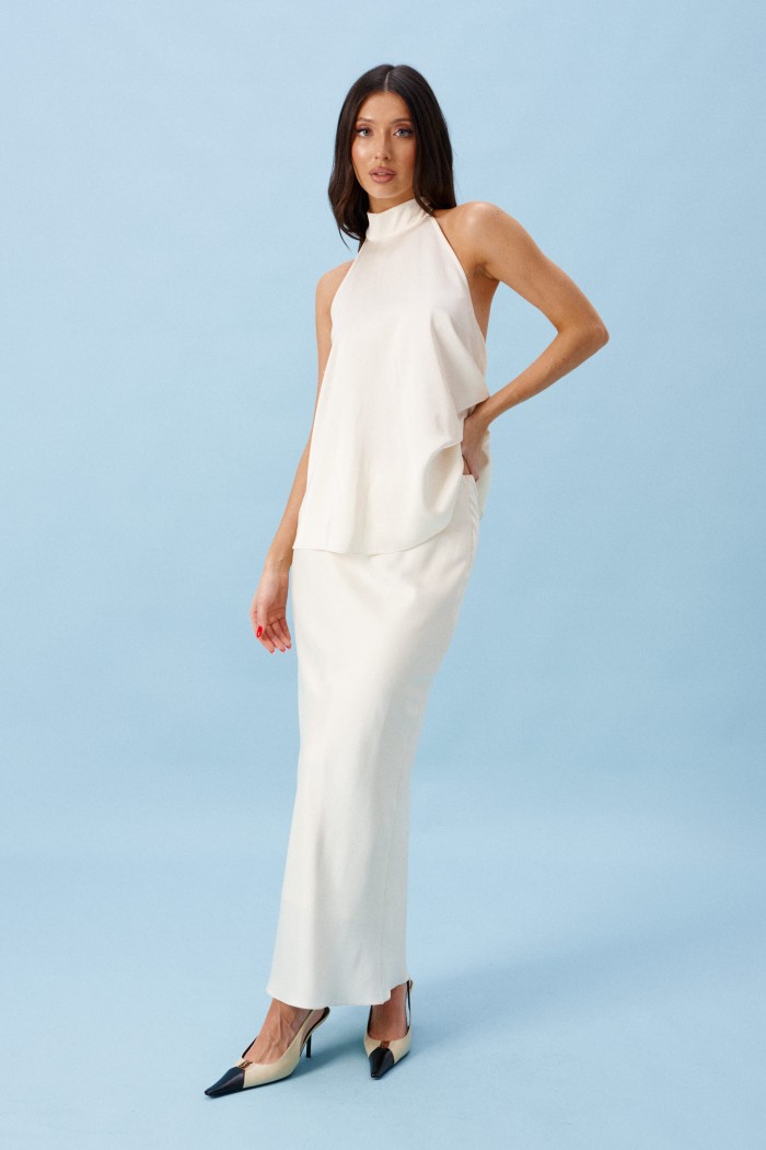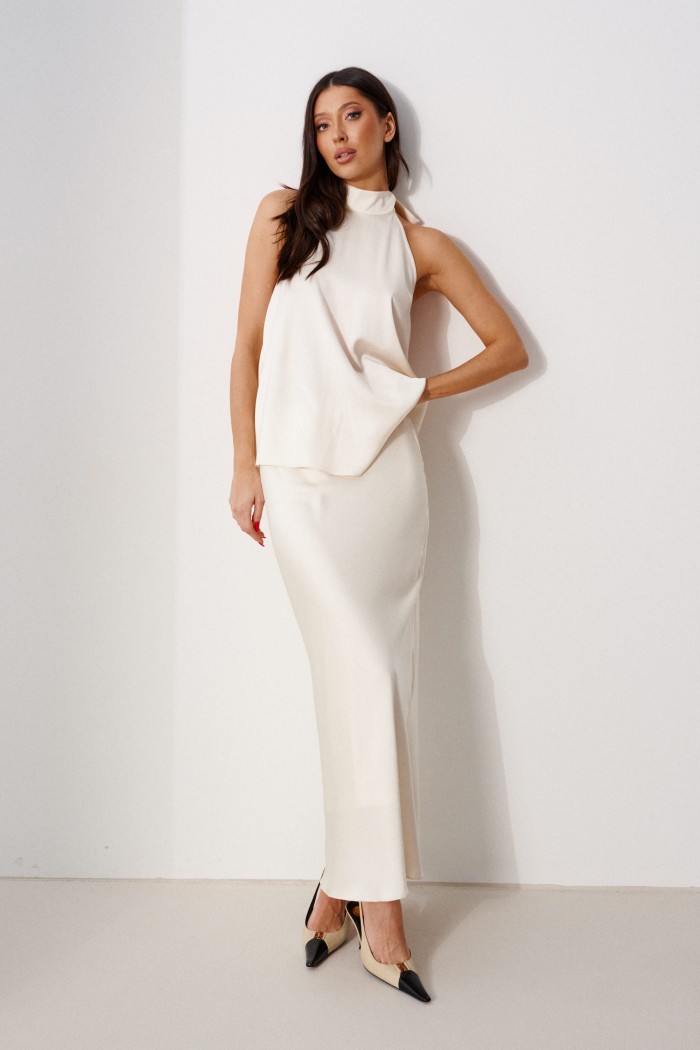 Блуза А-силуэта. Выполнена из лёгкого струящегося полотна кремового цвета. Горловина – стойка-лента, формирующаяй бант сзади. По спинке верхняя часть с вырезом-качелью. Длина по боковому шву 38 см