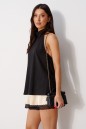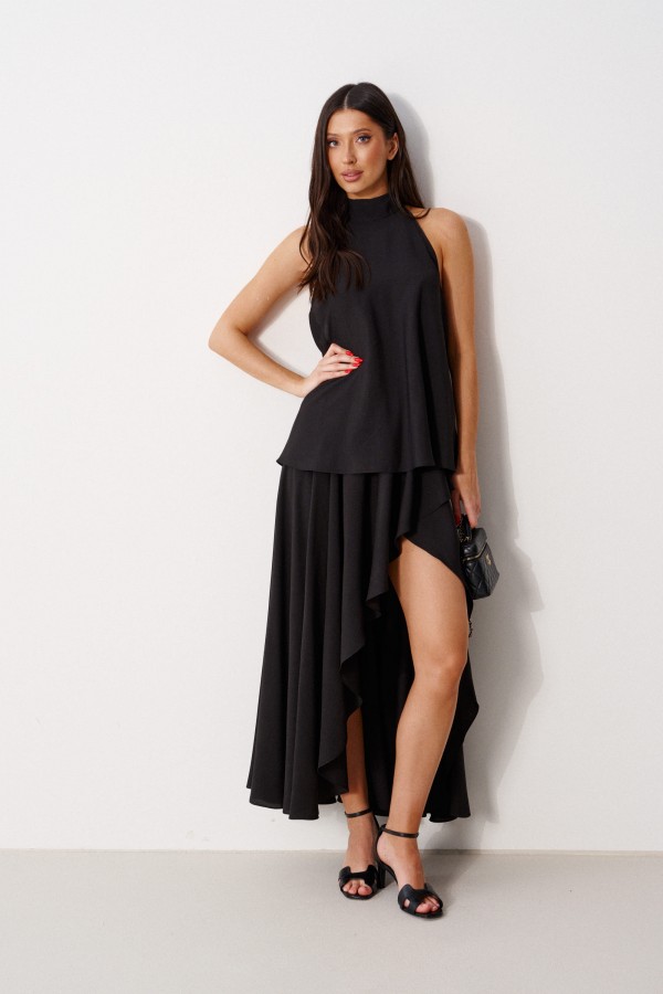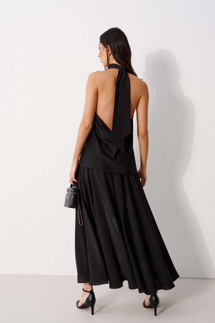 Блуза А-силуэта. Выполнена из лёгкого струящегося полотна черного цвета. Горловина – стойка-лента, формирующая бант сзади. По спинке верхняя часть с вырезом-качелью. Длина по боковому шву 39 см