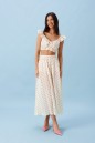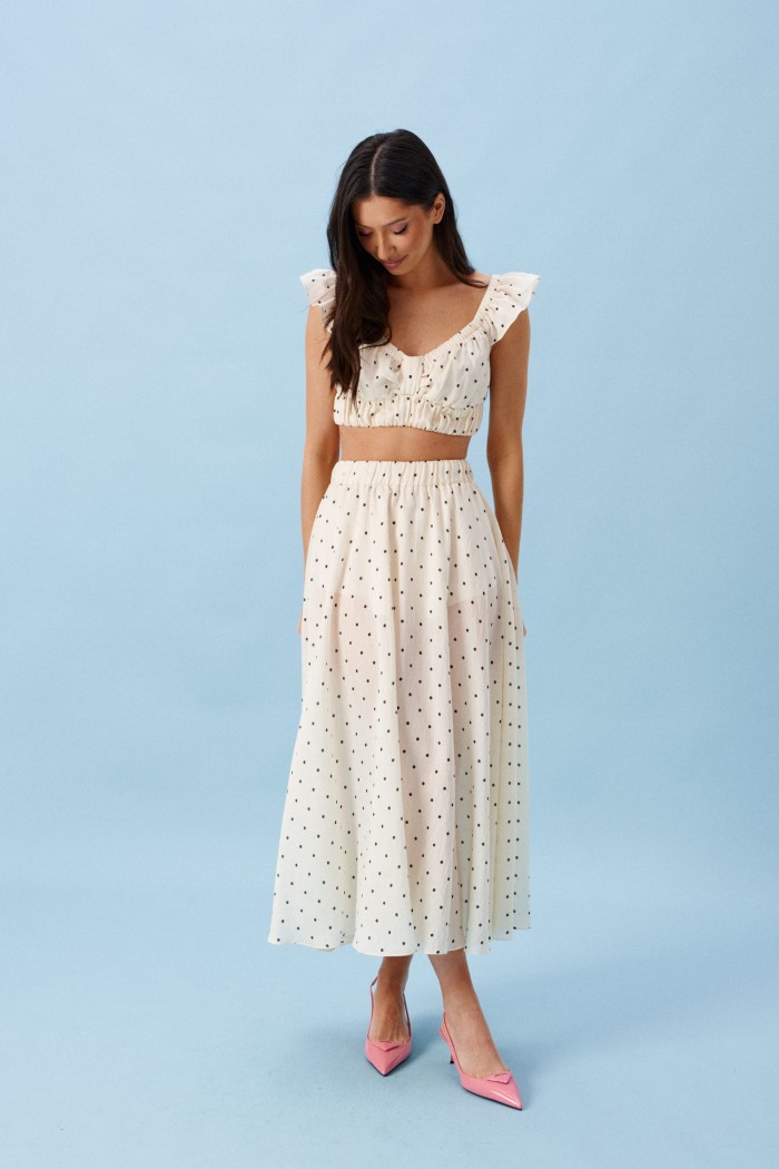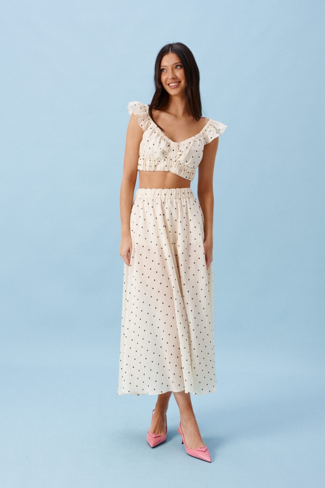 Топ. Выполнен из мягкого полупрозрачного полотна кремового цвета с горошком. С подкладкой. Глубокий вырез горловины. По переду горловины и по спинке резинка со сборкой. Бретели-воланы с резинками. Низ изделия на резинке. Длина спинки 20 см
