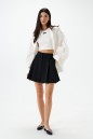 Юбка трапеция выполнена из полотна черного цвета. Харектеристики: силуэт трапеция, пояс стабильный с шлевками, заскрытая застежка на молнии и крючках, складки, в боковых швах карманы. Длина 41 см.