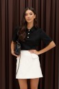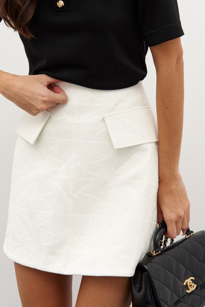 Юбка выполнена из белой экокожи с вышивкой-орнаментом . Характеристики: полуприлегающий А-образный силуэт, подкладка, застежка - потайная тесьма молния в среднем шве заднего полотна, по переду имитация карманов с клапаном. Длина по боковому шву 43 см.