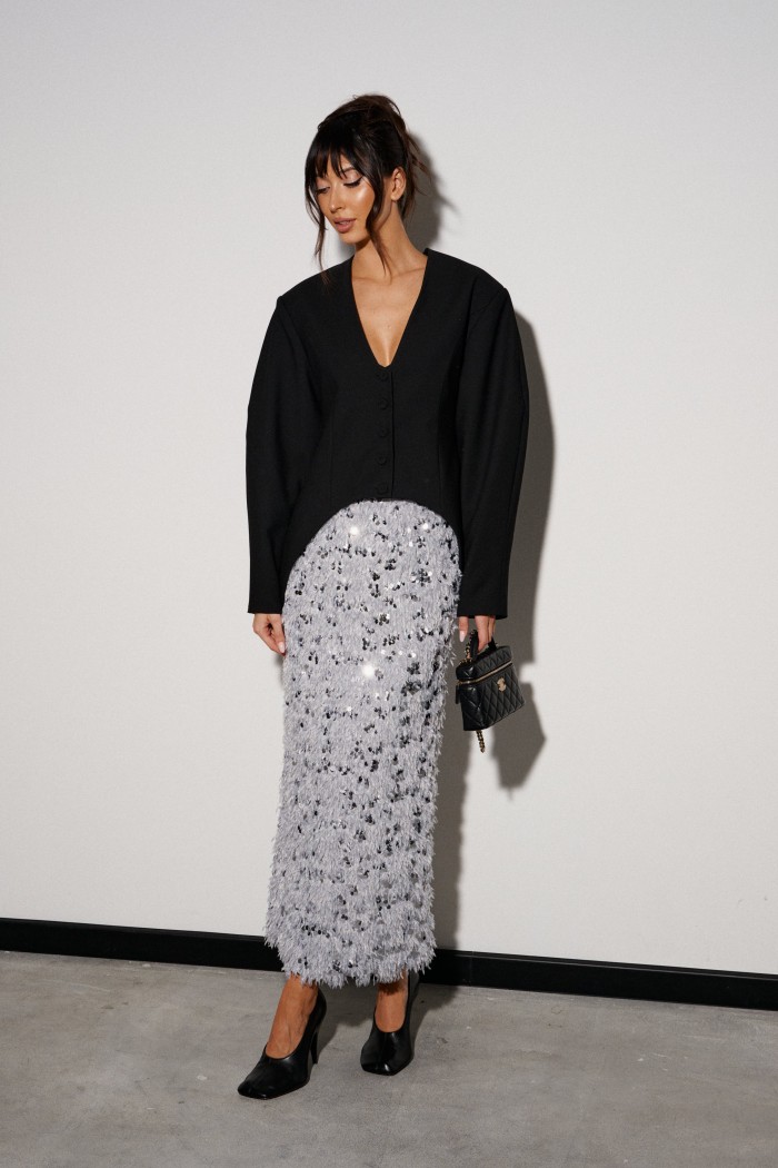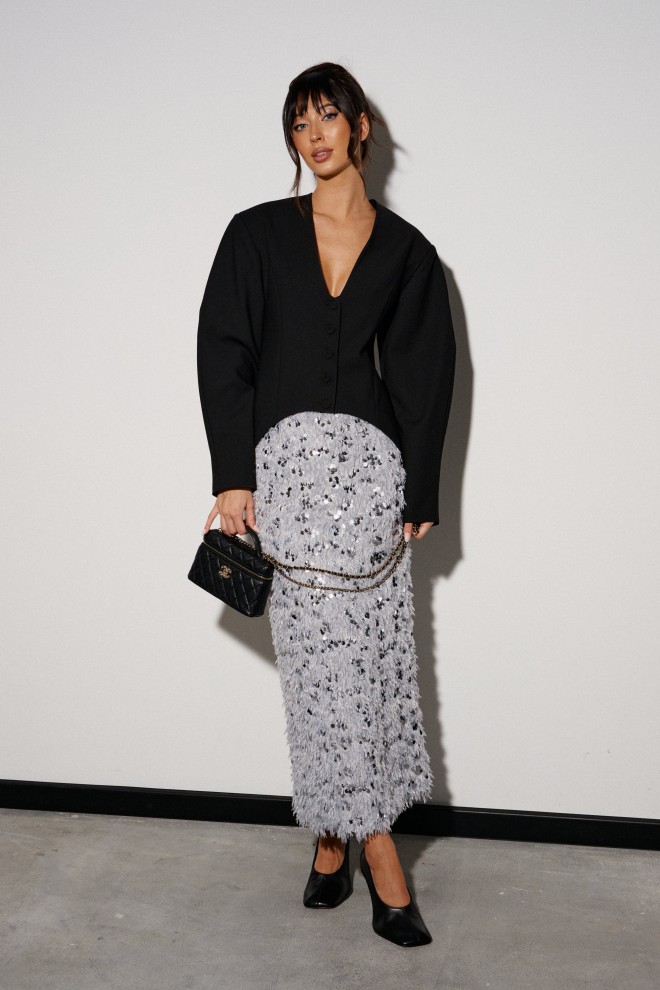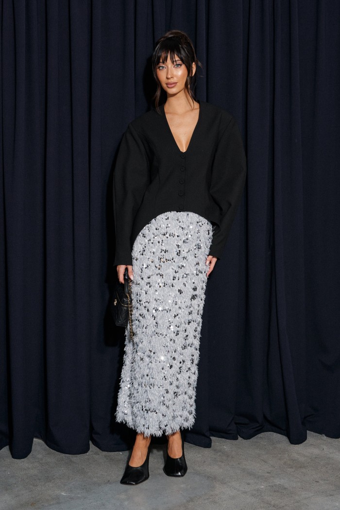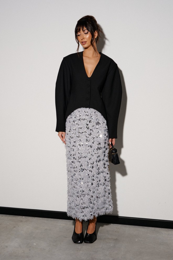 Юбка прямого кроя выполнена из светло-серого полотна с перьями и пайетками. Характеристики: прямой крой, подкладка, пояс на резинке, в среднем шве заднего полотна изделия разрез 49 см. Длина юбки 92 см.
