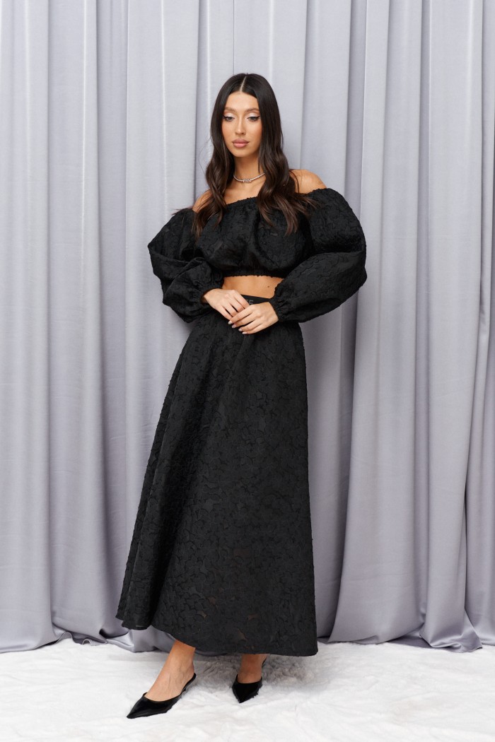 Юбка женская выполнена из черного полупрозрачного фактурного полотна с эластичным поясом. Характеристики: подкладка в длине мини, крой "солнце", пояс притачная резинка, по поясу нанесен логотип бренда - ANNETE. Длина изделия 96см.