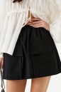 Юбка выполнена из текстильного полотна черного цвета, силуэт "трапеция". Характеристики: подкладка, пояс на резинке, по переду крупные функциональные накладные карманы. Длина 36 см