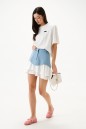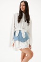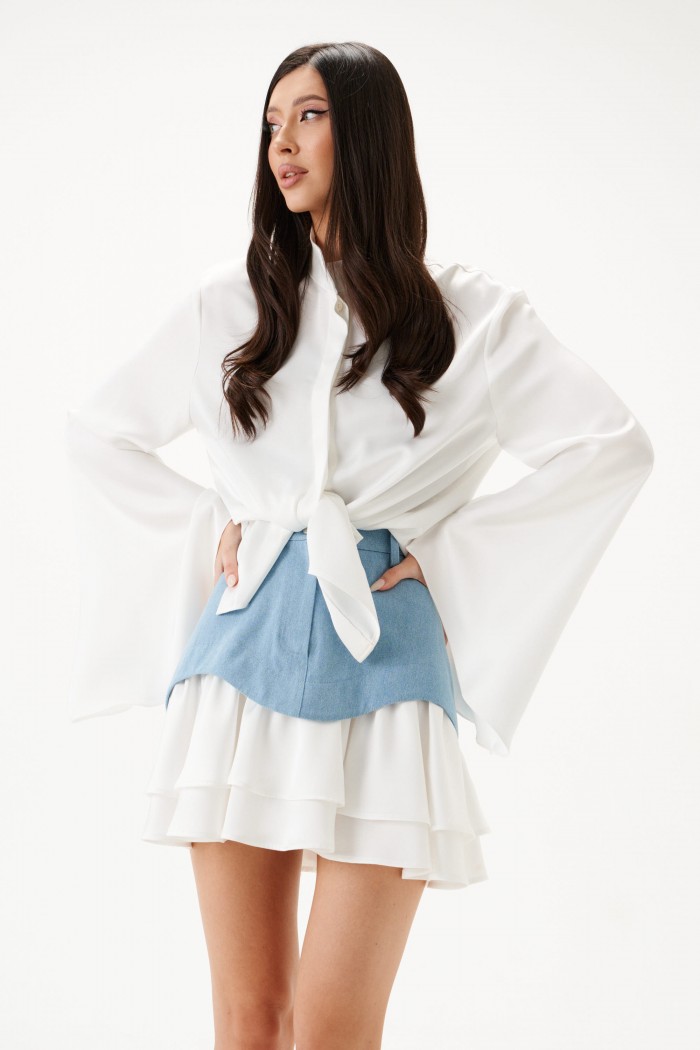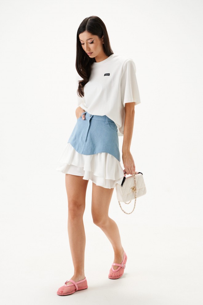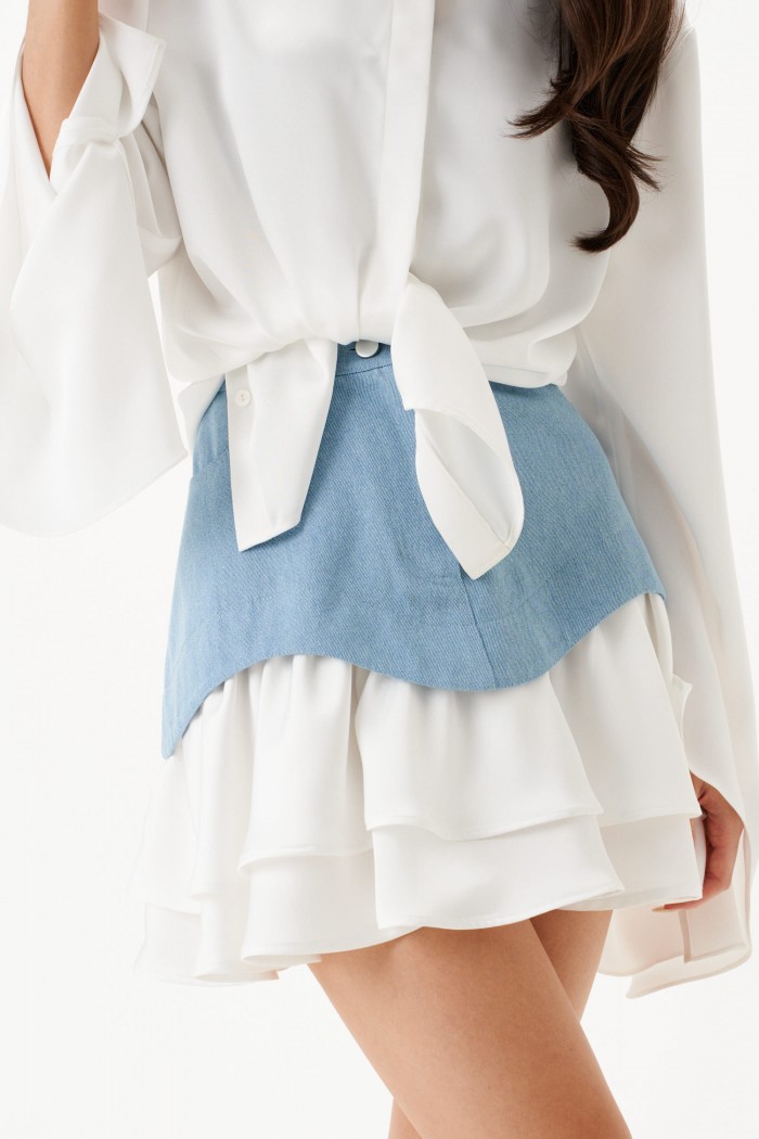 Юбка из джинсового полотна голубого цвета с дополнительным внутреннем слоем из струящегося полотна белого цвета. Кроткая, расширенная к низу, на подкладке. Карманы по переду боковые с отрезным бочком, по спинке – фигурные накладные. Застежка брючного типа с гульфиком на молнии. Низ из основной ткани фигурный-волнообразный, с двумя рядами воланов из отделочной ткани. Пояс юбки притачной , прямой, стабильный, со шлевками. Длина юбки 44 см