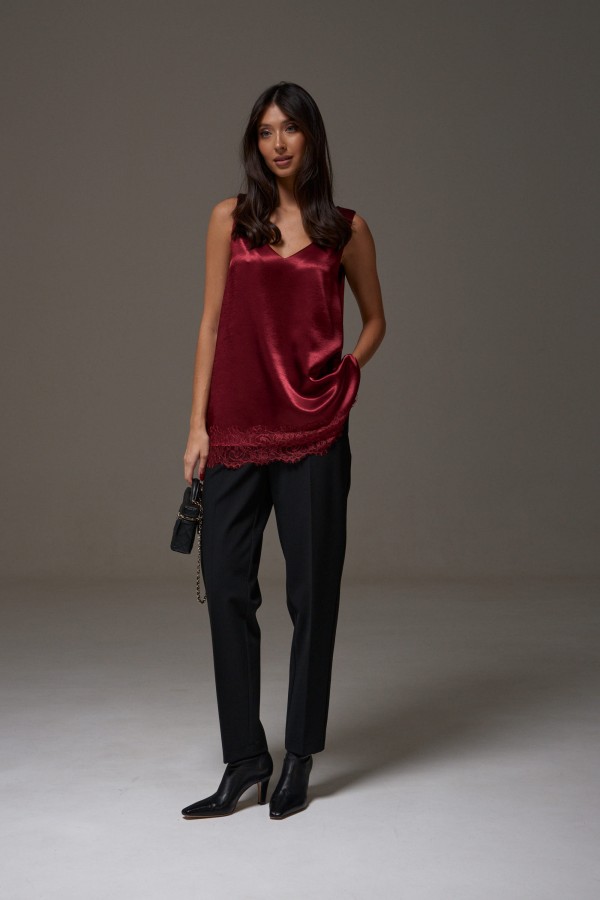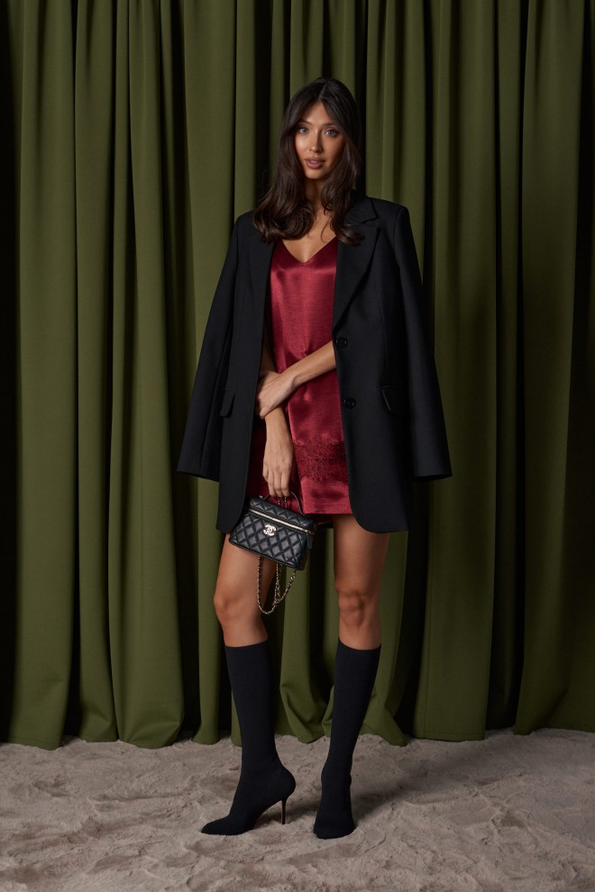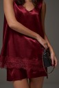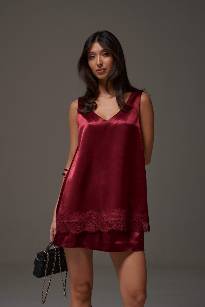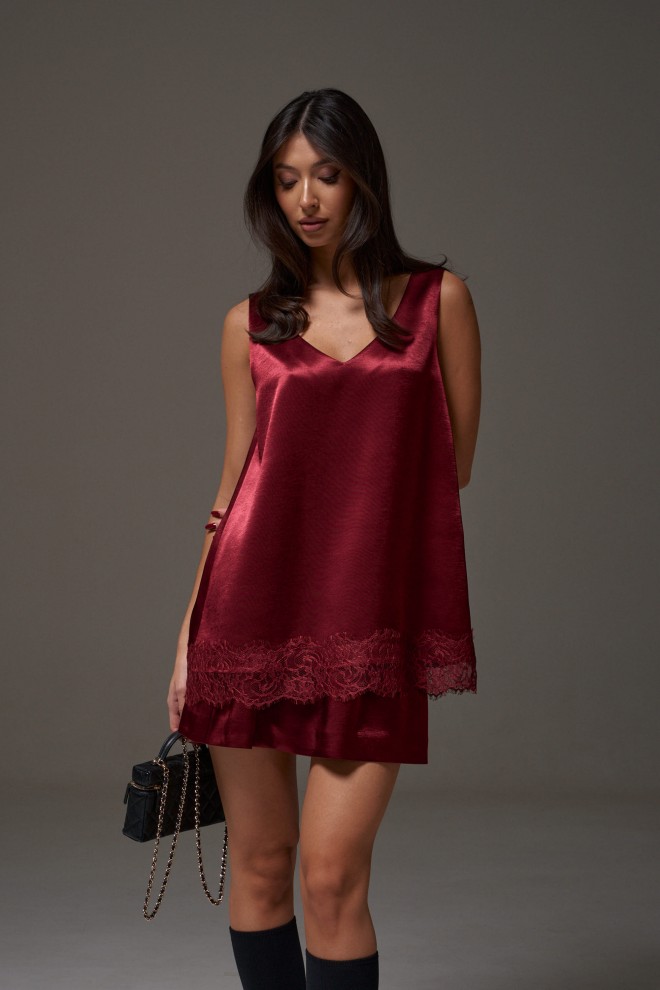 Юбка прямого кроя, выполнена из струящейся ткани бордового цвета. Характеристики: прямой крой, на подкладке, пояс на резинке. Длина по боковому шву 41 см.