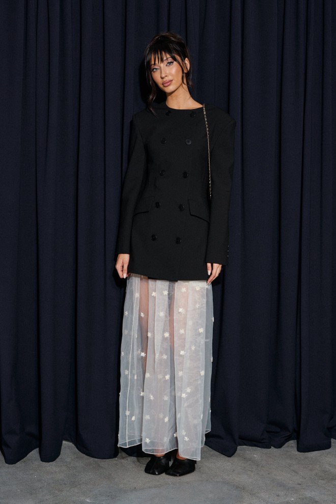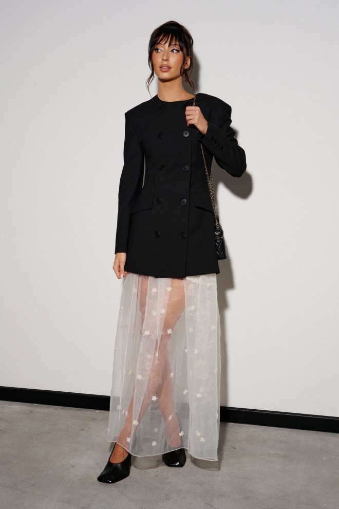 Юбка кроя полусолнце, выполнена из прозрачной ткани молочного оттенка с декоративной вышивкой.