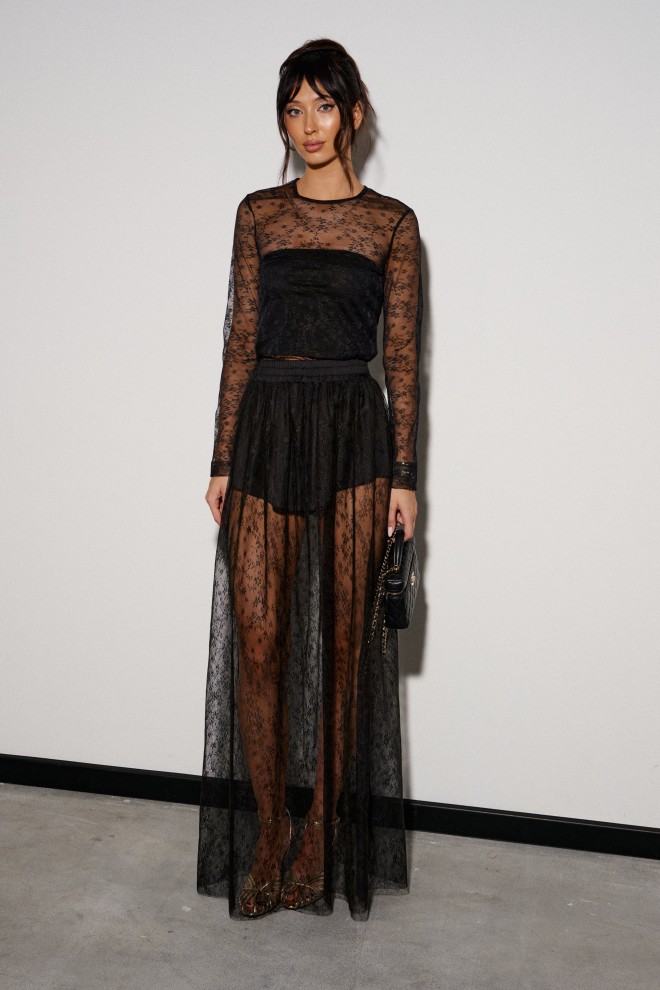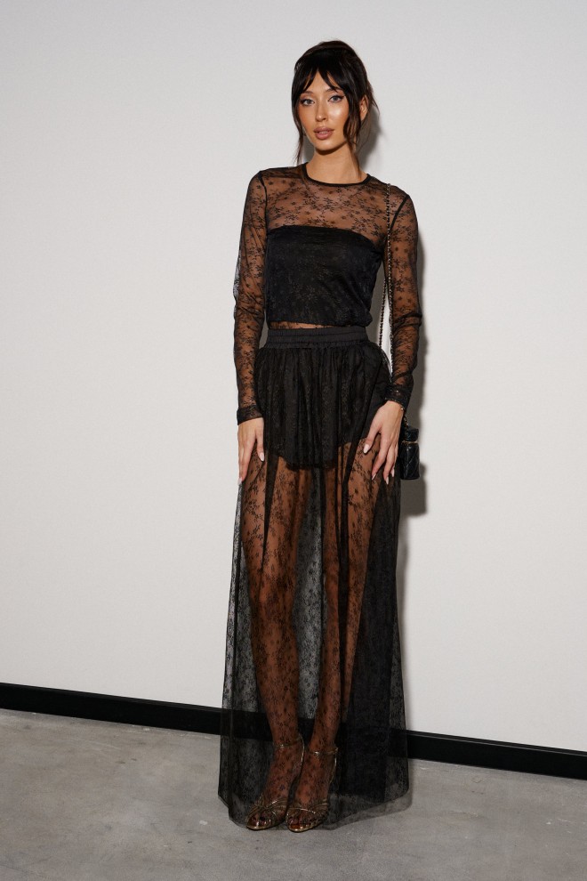 Юбка прямого кроя, выполнена из прозрачной ткани в сетку с декоративным узором.