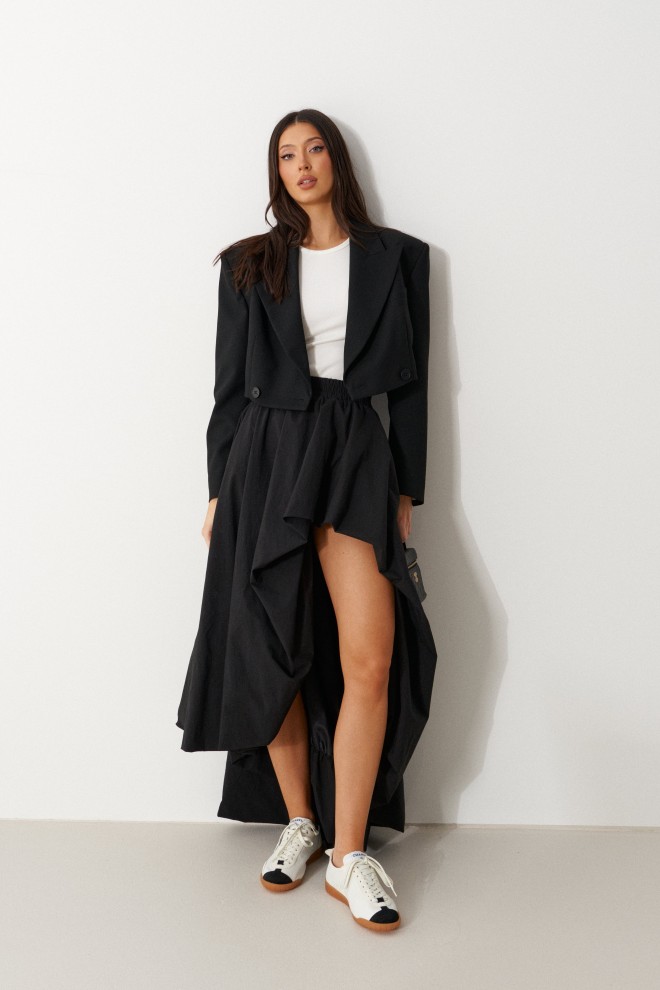 Юбка женская с фигурным низом, выполнена из полотна черного цвета. Характеристика: фигурный низ с глубоким вырезом на левом бедре, пояс на резинке, на подкладке, низ юбки на мягком подгибе. Длина юбки по самой длинной линии 99см, по самой короткой линии 34см.