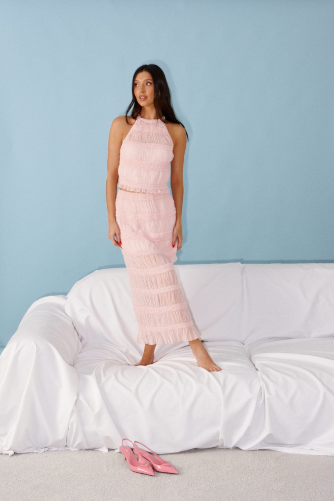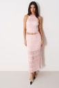Юбка-миди полуприлегающего силуэта. Выполнена из прозрачной фактурной ткани нежно-розового цвета. С подкладкой в длине мини. Пояс на резинке. Застежки в изделии нет. Длина 90 см