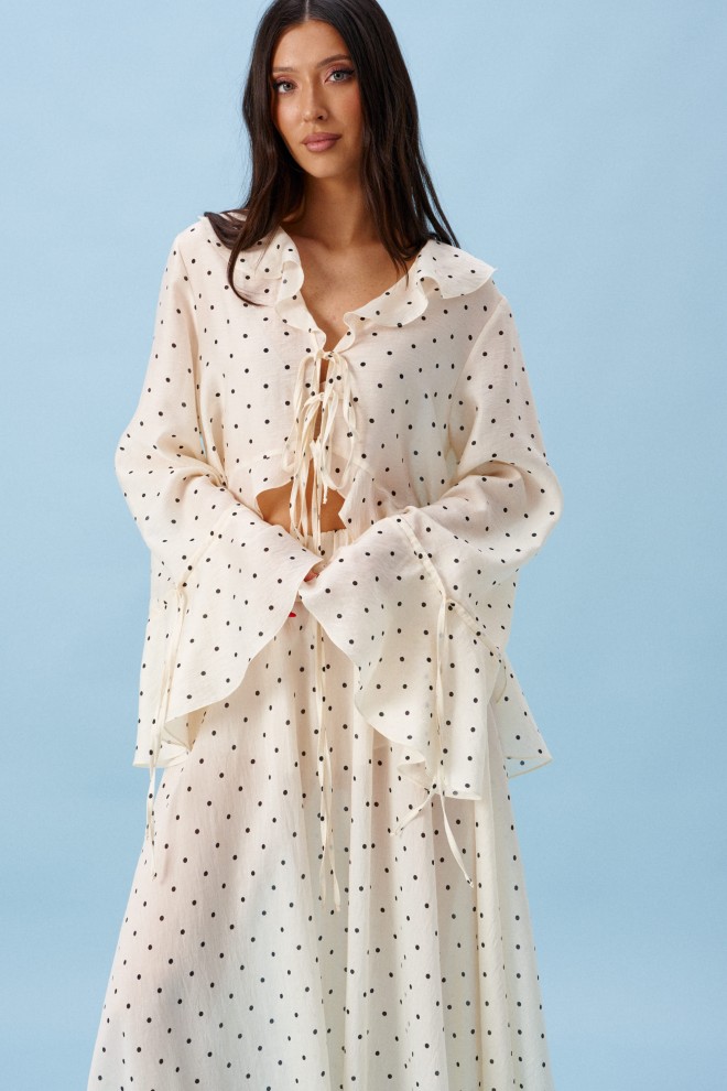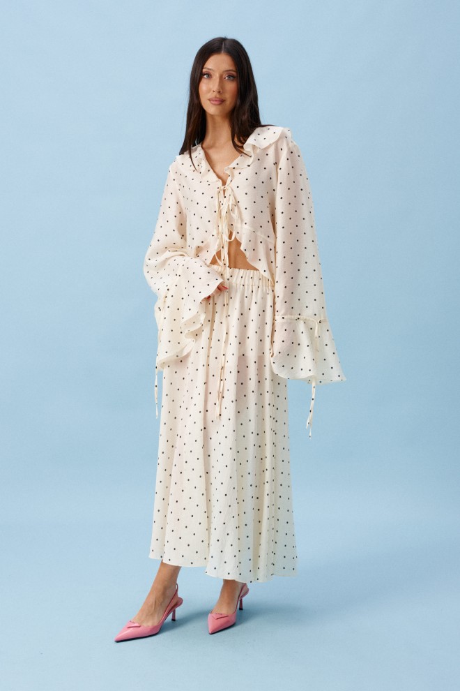 Юбка-миди. Выполнена из мягкого полупрозрачного полотна кремового цвета с горошком. С подкладкой-мини-шортики. Пояс на резинке. Длина 90 см