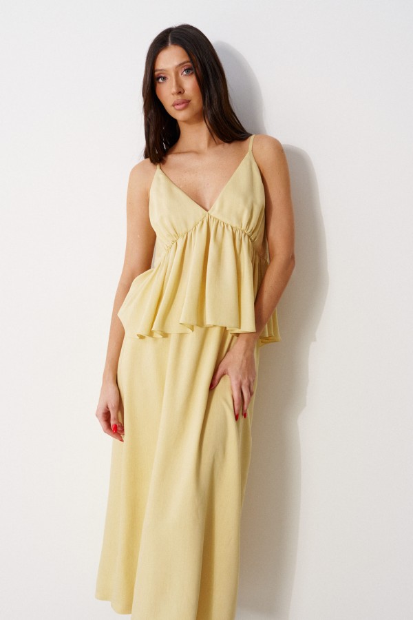 Юбка полуприлегающего силуэта выполнена из струящегося полотна желтого цвета на подкладке. Характеристики: полуприлегающий силуэт, пояс на резинке. Длина по боковому шву 86 см.