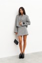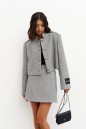 Жакет прямого свободного кроя,выполнен из твидовой ткани серого цвета с рисунком "елочка". Характеристики: горловина стойка, застежка центральнаяна петли пуговицы,рукав прямой, по плечевому шву пата на пуговице, на левом рукаве нашивка Annete. Длина по спинке 46 см, длина рукава 62 см.