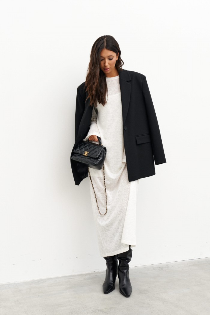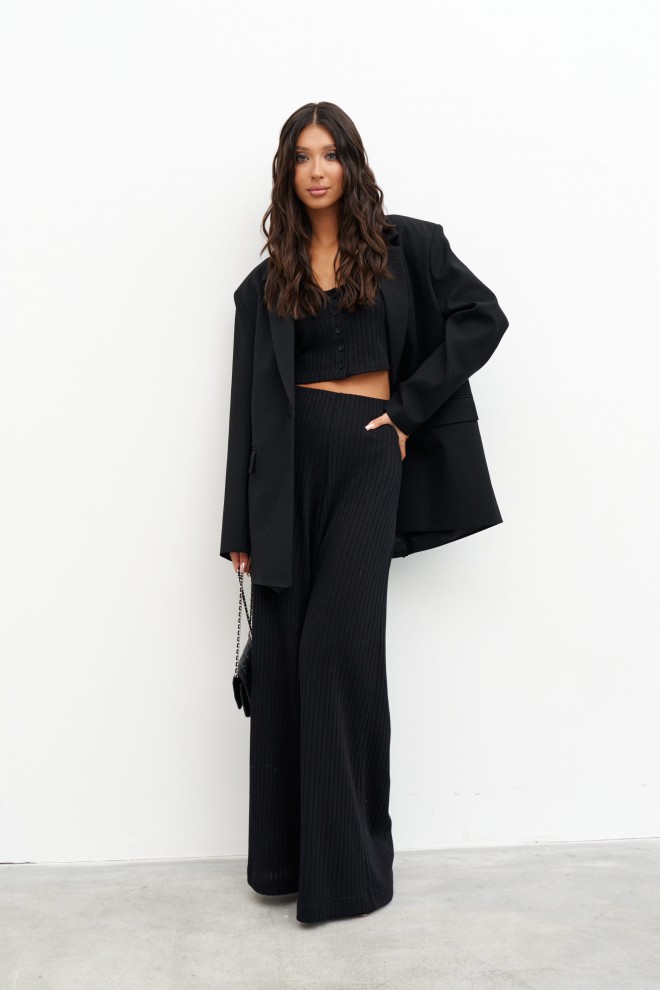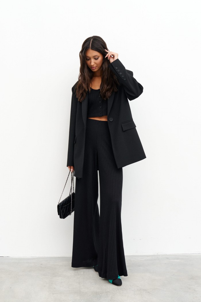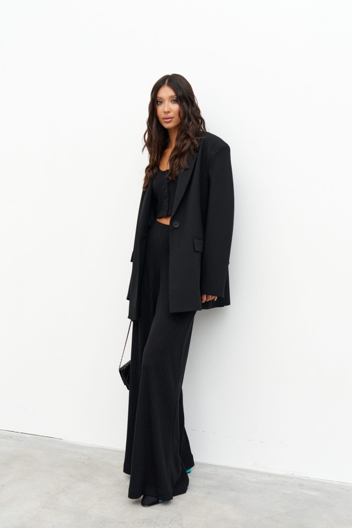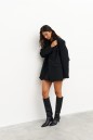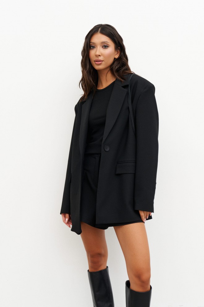 Жакет прямого свободного кроя выполнен из костюмной ткани черного цвета. Характеристики: прямой свободный крой, подкладка, подплечники, воротник с остроугольным лацканом, застежка центральная на петлю - пуговицу, по переду функциональные карманы с клапаном, рукав втачной, по низу рукава нашиты пуговички, спинка со средним швом, в среднем шве разрез 27 см. Длина по спинке 76, длина рукава 63 см.