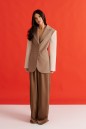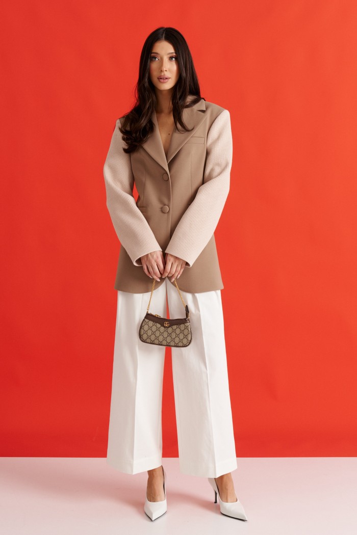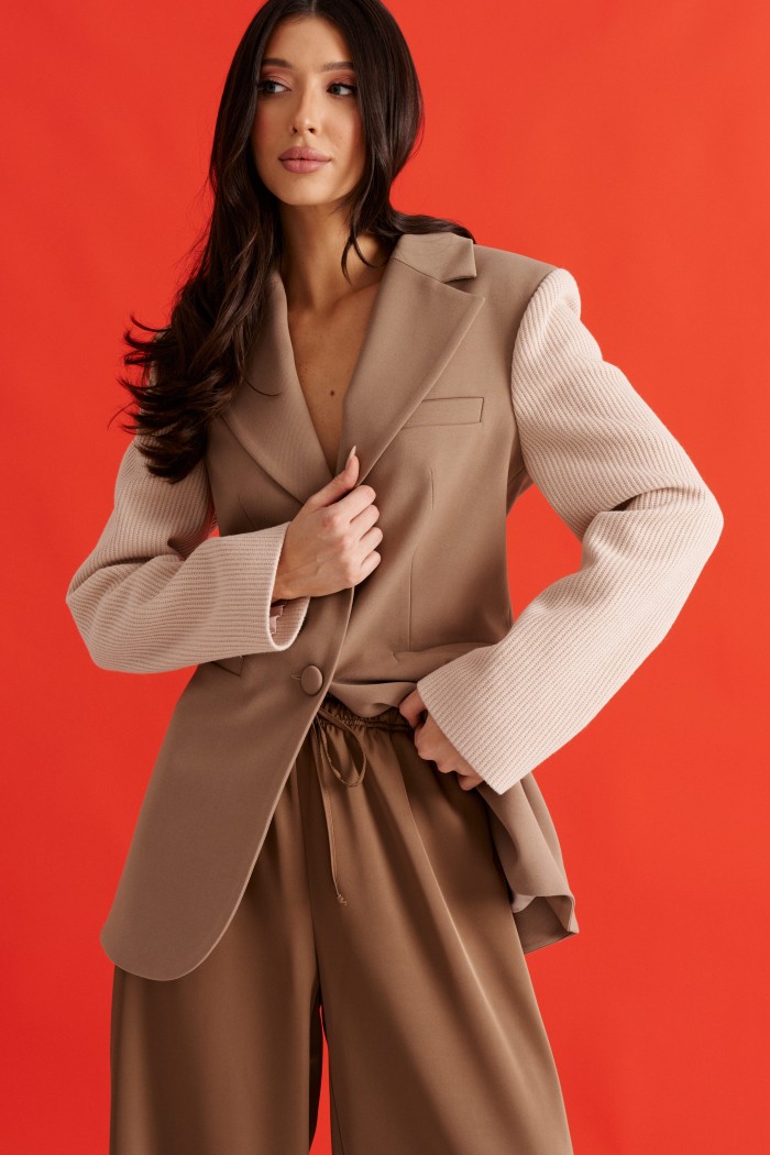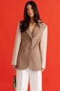 Жакет прилегающего силуэта. Выполнен из пальтовой ткани бежевого цвета в комбинации с пальтовой фактурной тканью. Воротник отложной с лацканами. Рукав втачной. Есть подкладка. По переду вверху имитация карманы с листочкой, внизу функциональные карманы с листочкой. Застёжка центральная петли-пуговицы. Длина спинки 74 см, длина рукава 64 см