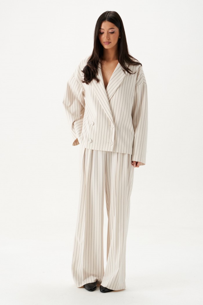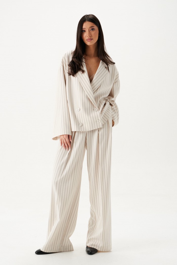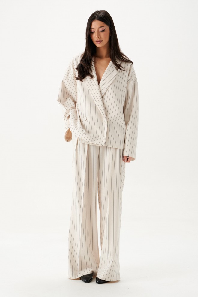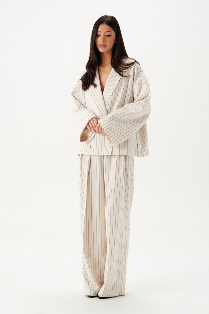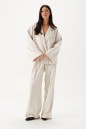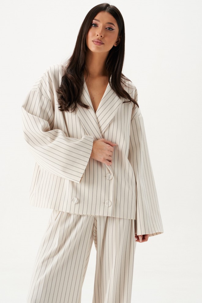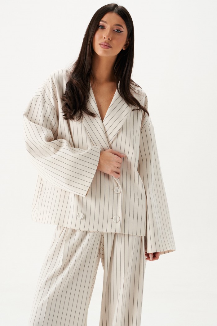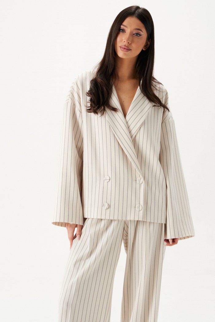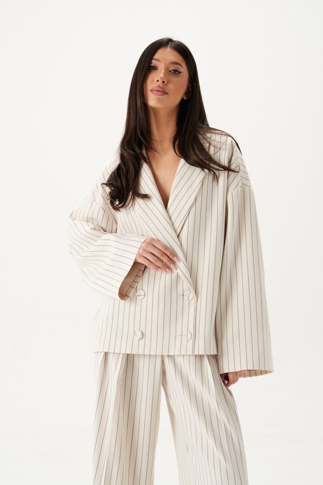 Жакет прямого кроя. Жакет двубортный, подклад, воротник с остроугольным лацканом, в боковых швах изделия карманы, рукав спущеный, прямой. Длина рукава от края горловины длина 75 см. Длина жакета по спинке от края горловины 63 см.
