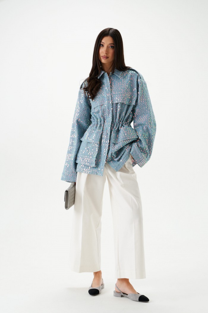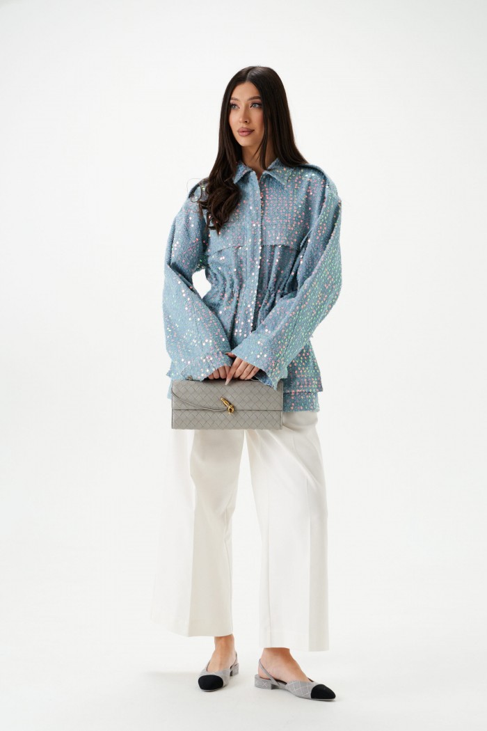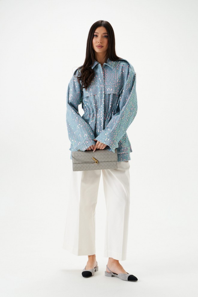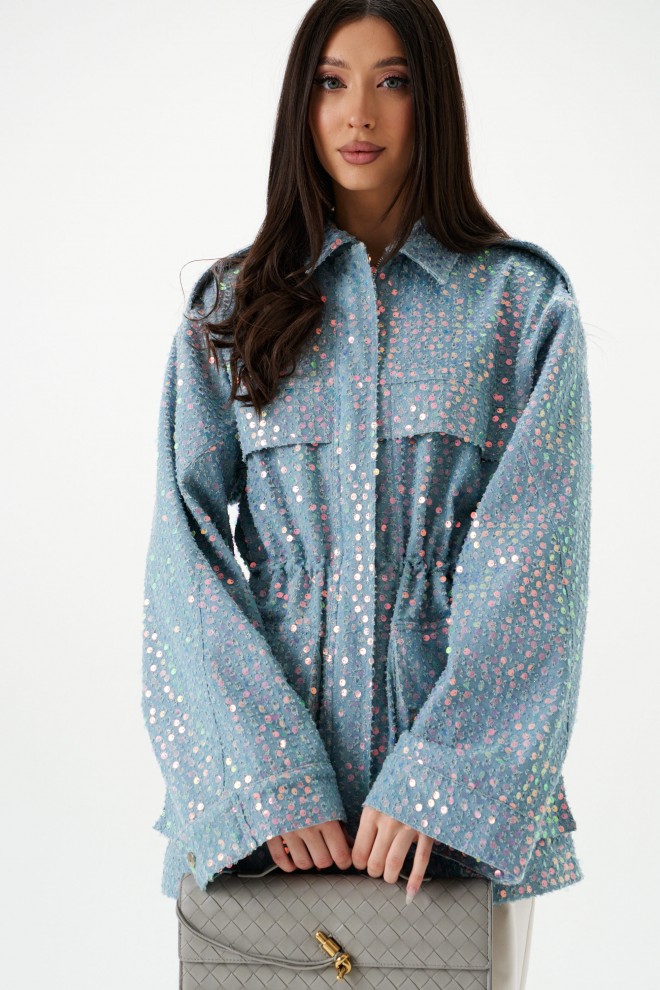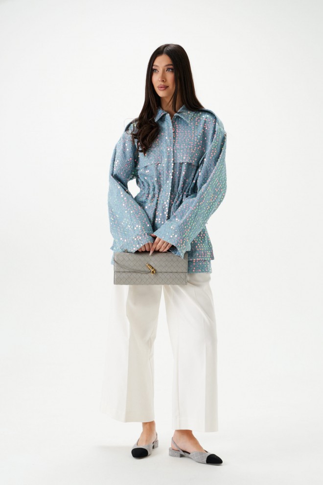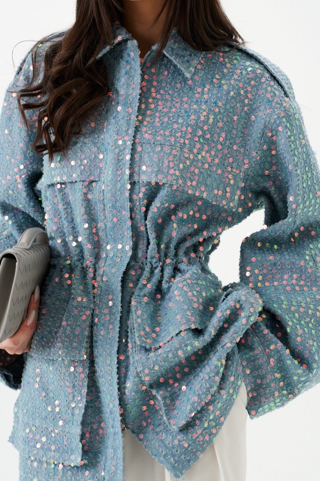 Жакет женский, приталенного силуэта, на подкладке, удлиненный голубого цвета с пайетками. Горловина круглая с отложным воротником.