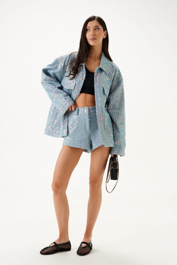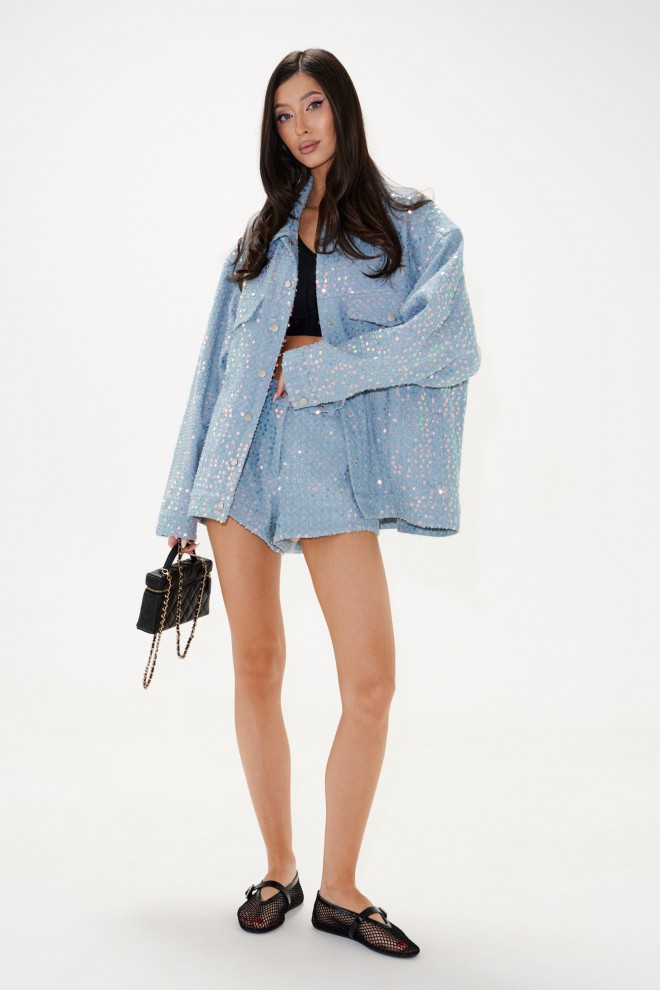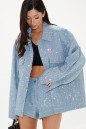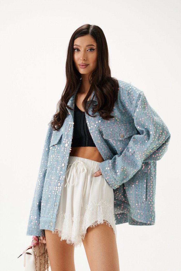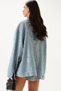 Жакет свободного кроя. Выполнен из джинсовой ткани голубого цвета на люрексной основе с перфорацией и пайетками. Воротник отложной. Рукав втачной, немного спущен. На рукаве манжета с кнопкой. Застежка центральная - кнопки. На уровне линии груди карманы с клапаном, внизу карманы с листочкой. Спинка отрезная. По низу изделия отрезная планка-пояс. На планке два хлястика с кнопками. Изделие без подкладки. Длина спинки 71 см. Длина рукава от линии втачивания 60 см