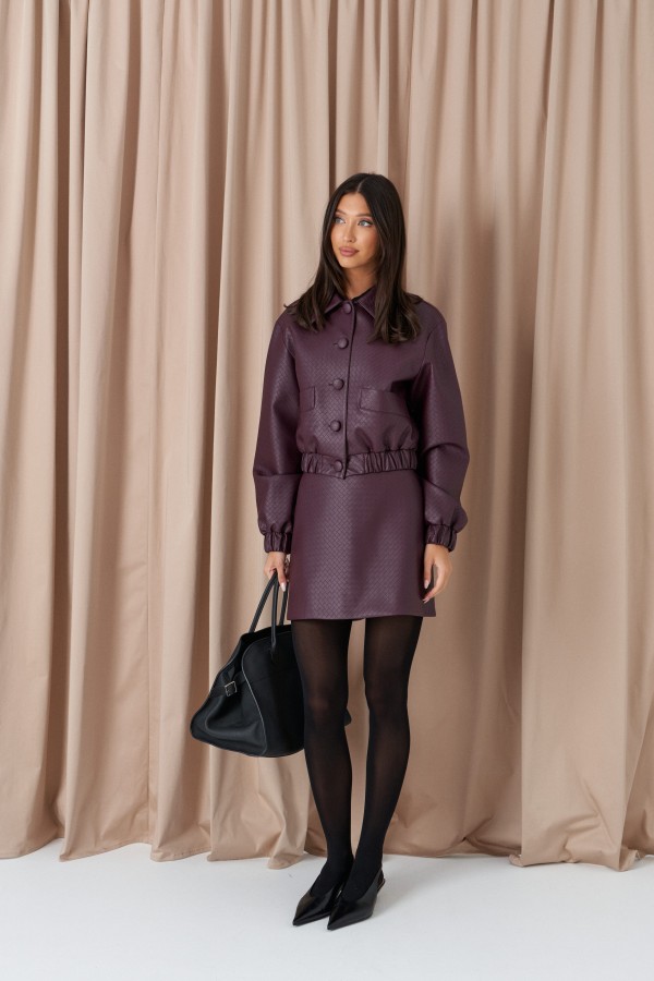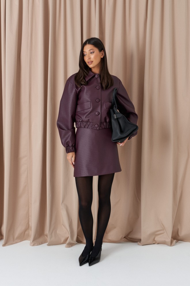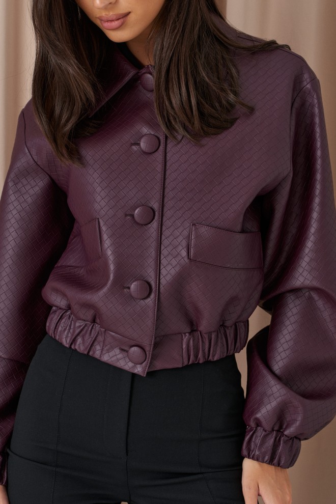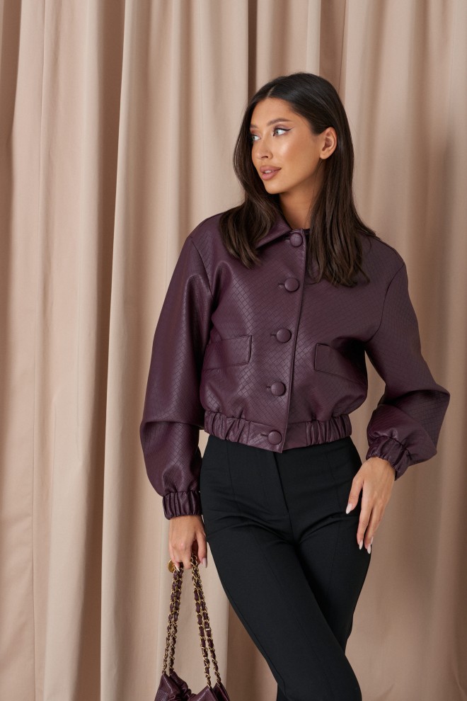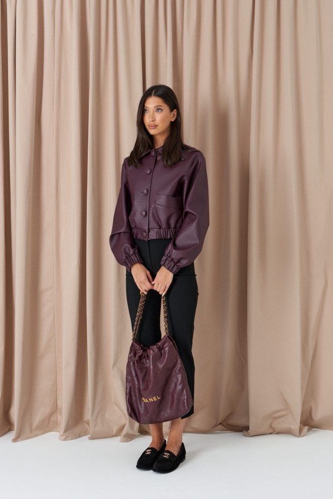Куртка. Выполнена из фактурной эко-кожи бордового цвета. С подкладкой. Воротник отложной. Рукав втачной, немного спущен, с мантежой на резинке. Низ изделия с резинкой. По переду прорезные карманы. Застёжка центральная пуговицы. Длина спинки 49 см. Длина рукава от линии втачивания 61 см