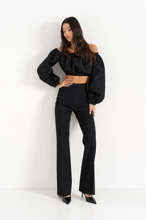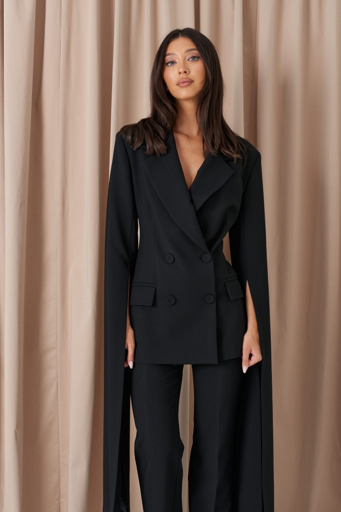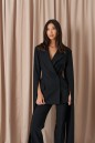 Жакет двубортный прилегающего силуэта. Выполнен из костюмной ткани чёрного цвета. С подкладкой. Воротник отложной, с лацканами. Застёжка центральная пуговицы. Рукав акцентный, удлинённый, с разрезом, с расширением к низу. По переду карманы с клапаном. Длина спинки 70 см. Длина рукава от линии втачивания 119 см. Длина разреза на рукаве 81 см