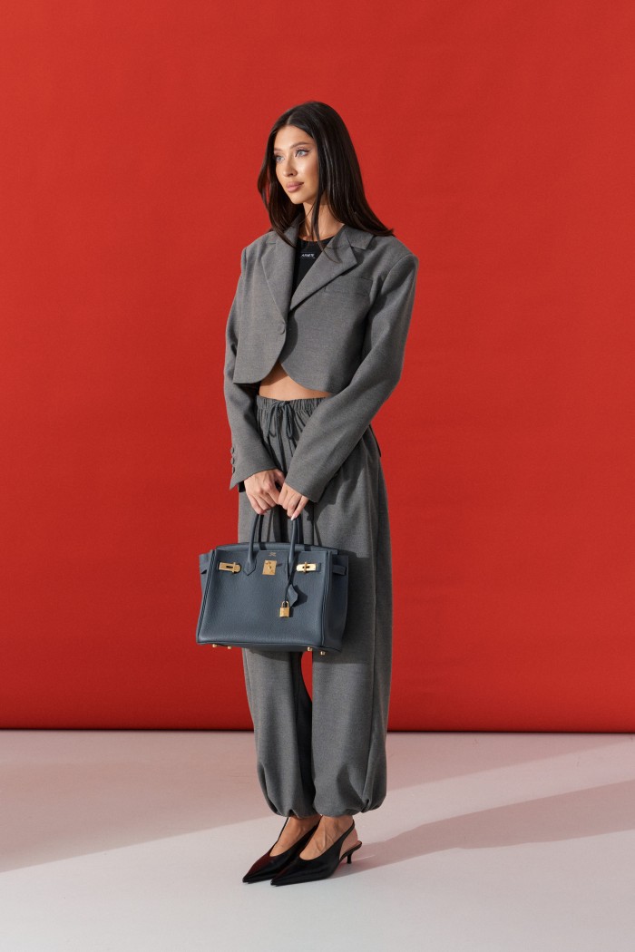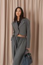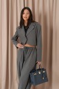 Жакет прямого кроя. Выполнен из ткани выполнен из костюмной ткани серого цвета. Характеристики: укороченный, брендированная подкладка, подплечники, отложной воротник с остроугольным лацканом, застежка центральная - петля пуговица, низ изделия с плавным срезом, рукав втачной по низу рукава нашиты пуговички. Длина по спинке от края горловины 44см, длина рукава от края горловины 78 см.