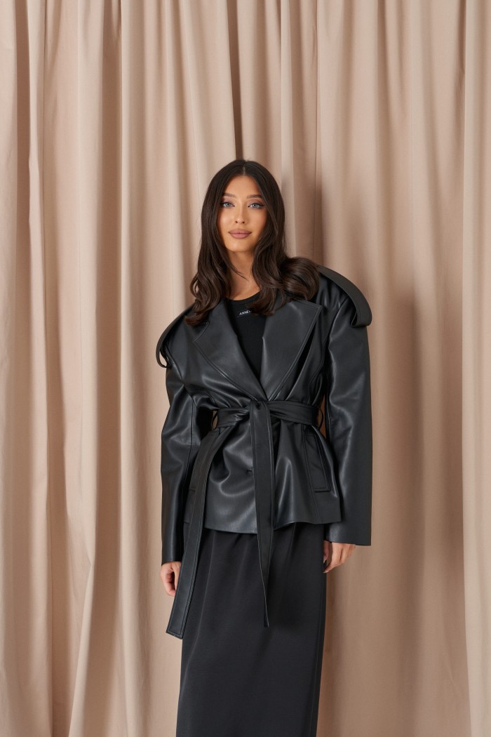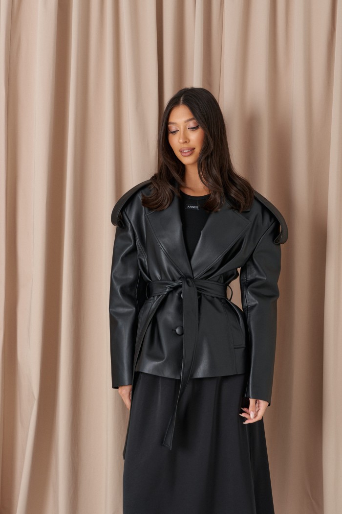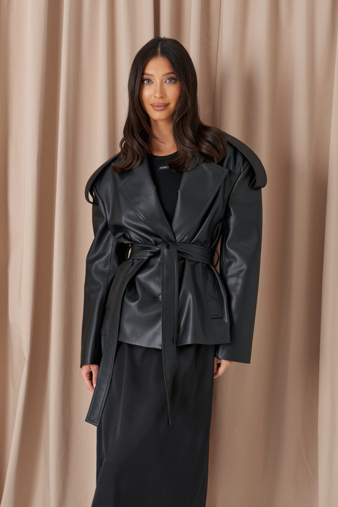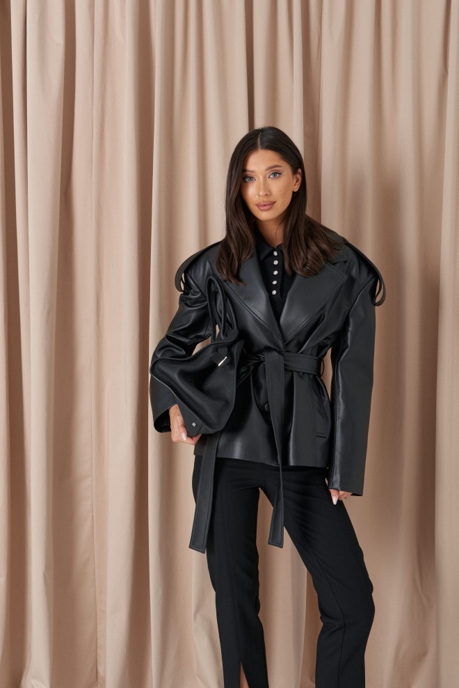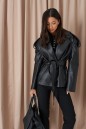 Куртка прямого кроя выполнен из эко-кожи черного цвета. Характеристики: прямой крой, брендированная покладка, подплечники, отложной воротник с остроугольным лацканом, застежка центральная на петли пуговицы, по линии талии шлевки, в комплекте пояс из ткани основного изделия, рукав втачной. По линии плеча погон с пуговицей, в среднем шве заднего полотна изделия шлица 17 см. В боковых швах изделия карманы. Длина по спинке 65 см, длина рукава 58 см.
