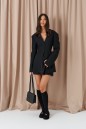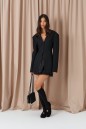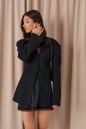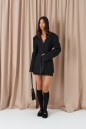 Жакет полуприлегающего силуэта, выполнен из костюмной ткани черного цвета. Характеристика: полуприлегающий крой, v-образный вырез, центральная застежка на петли-пуговицы, двойные выточки по талии, брендированный подклад, втачной рукав, плечики, на манжете небольшой разрез. Длина по спинке 73см, длина рукава 64см.