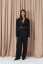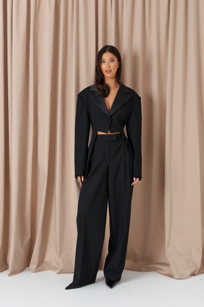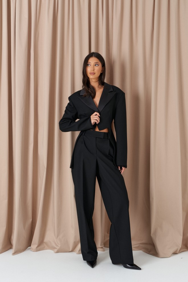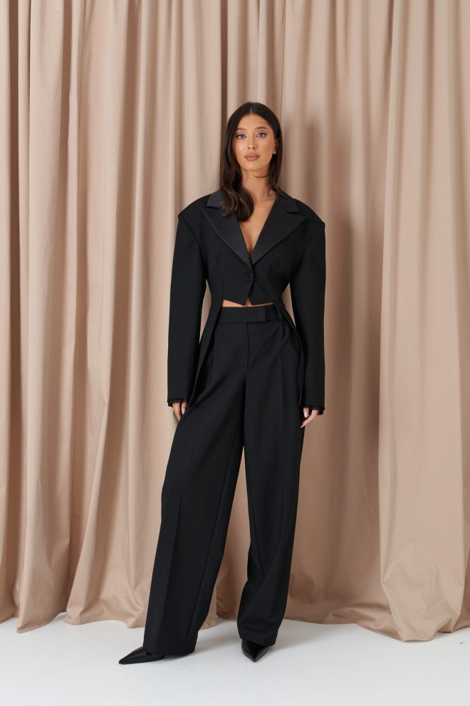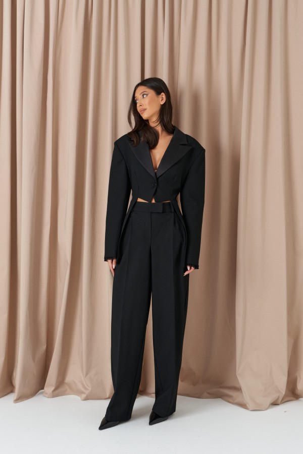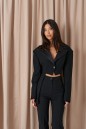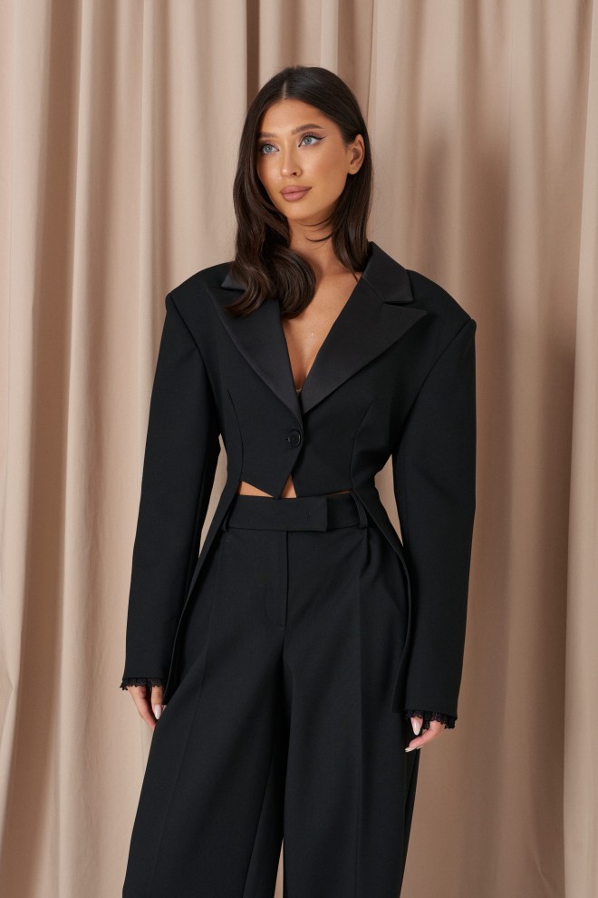 Жакет полуприлегающего силуэта, выполнен из костюмной ткани черного цвета. Характеристика: полуприлегающий крой, отложной воротник из с лацканов, выполнен из сатиновой ткани, центральная застежка на пуговицу, выточки, втачные боковые детали, средняя часть жакета укорочена,брендированный подклад, втачной рукав, чуть спущен, плечики, на манжетах пришито кружево. Длина по спинке 73см, длина рукава от края горловины 72см.