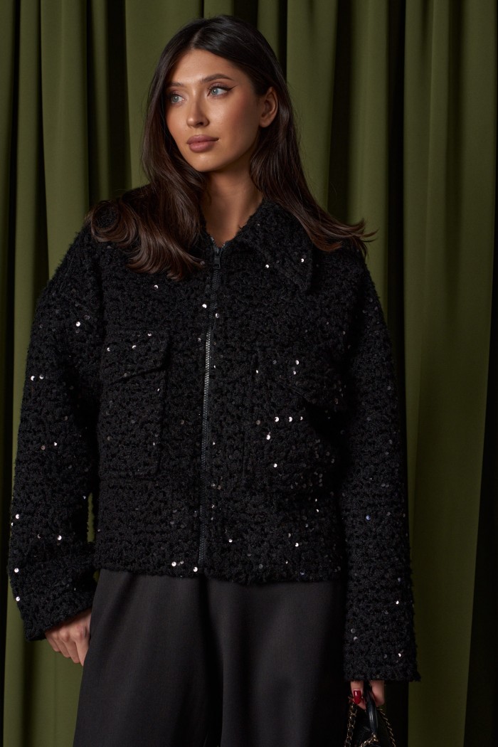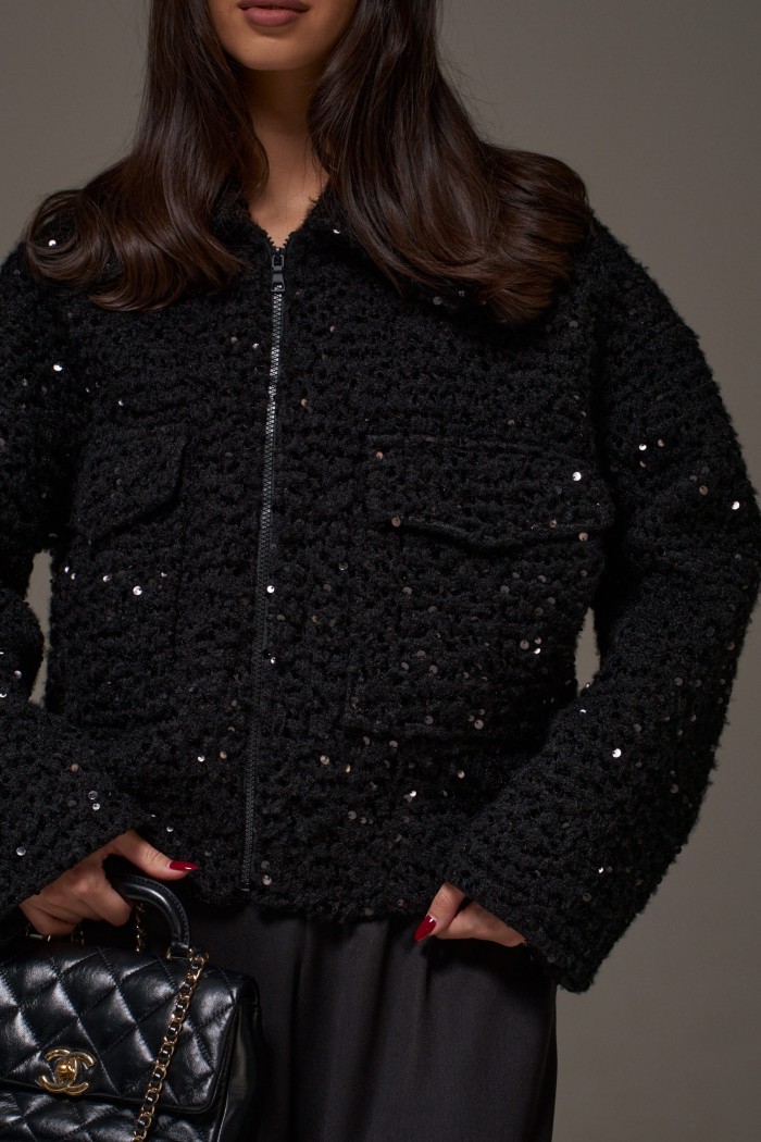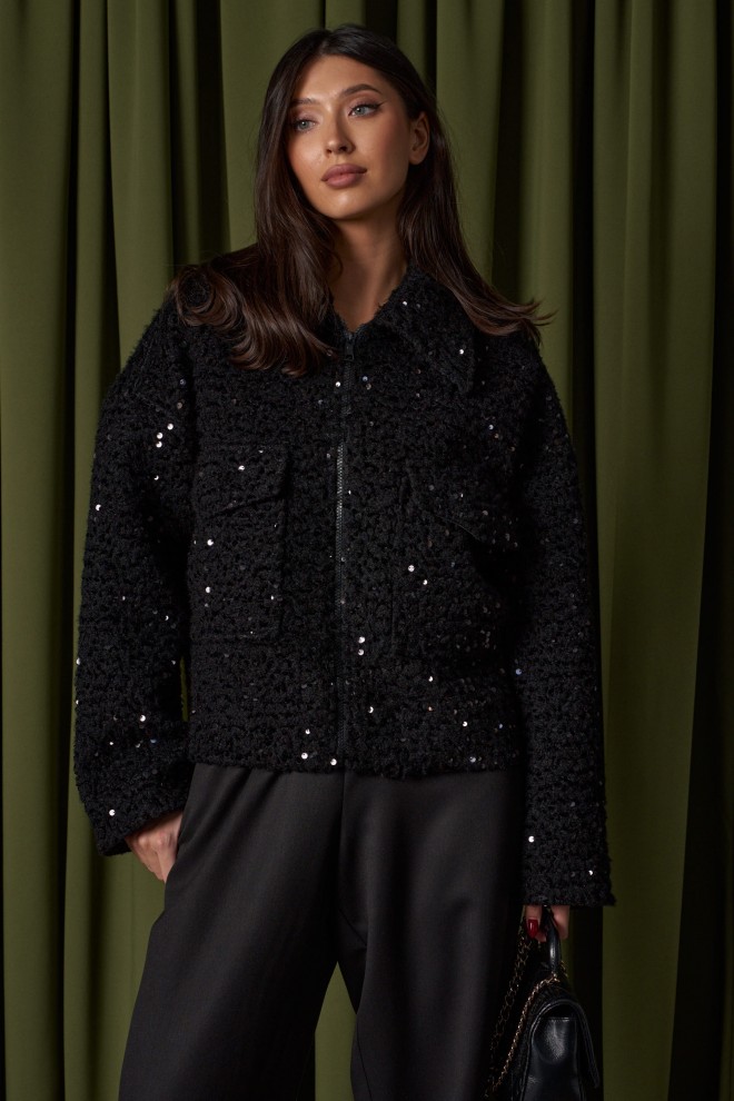 Жакет прямого свободного кроя. Выполнен из фактурной плотной (пальтовой) ткани чёрного цвета с пайетками. С подкладкой. Воротник отложной. Рукав втачной, спущенный. Застёжка центральная - молния. По переду накладные карманы с клапаном (с боковым входом). Спинка цельнокроеная. Длина рукава от линии втачивания 54 см. Длина спинки 59 см