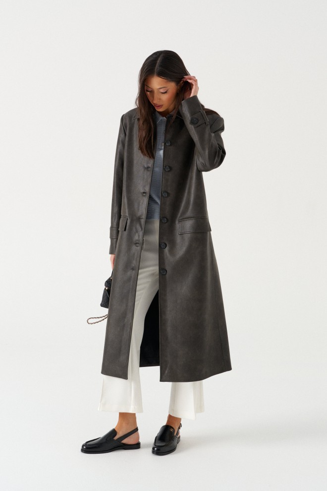 Удлиненный плащ прямого свободного кроя, выполнен из экокожи. Характеристики: отложной воротник, застежка центральная на петли - пуговицы. Брендированная подкладка, подплечники. Рукав втачной, по низу рукава пата с пуговицей. В комплекте идет пояс из основной ткани изделия. По переду карманы с клапаном. В среднем шве спинки шлица 44см. Длина изделия 117 см, длина рукава от края горловины 79.5 см.