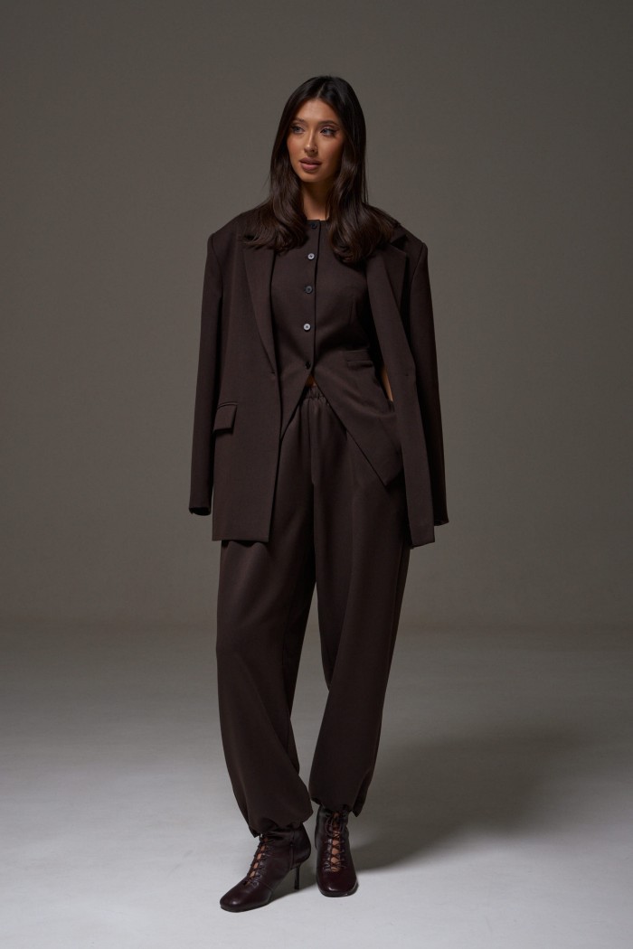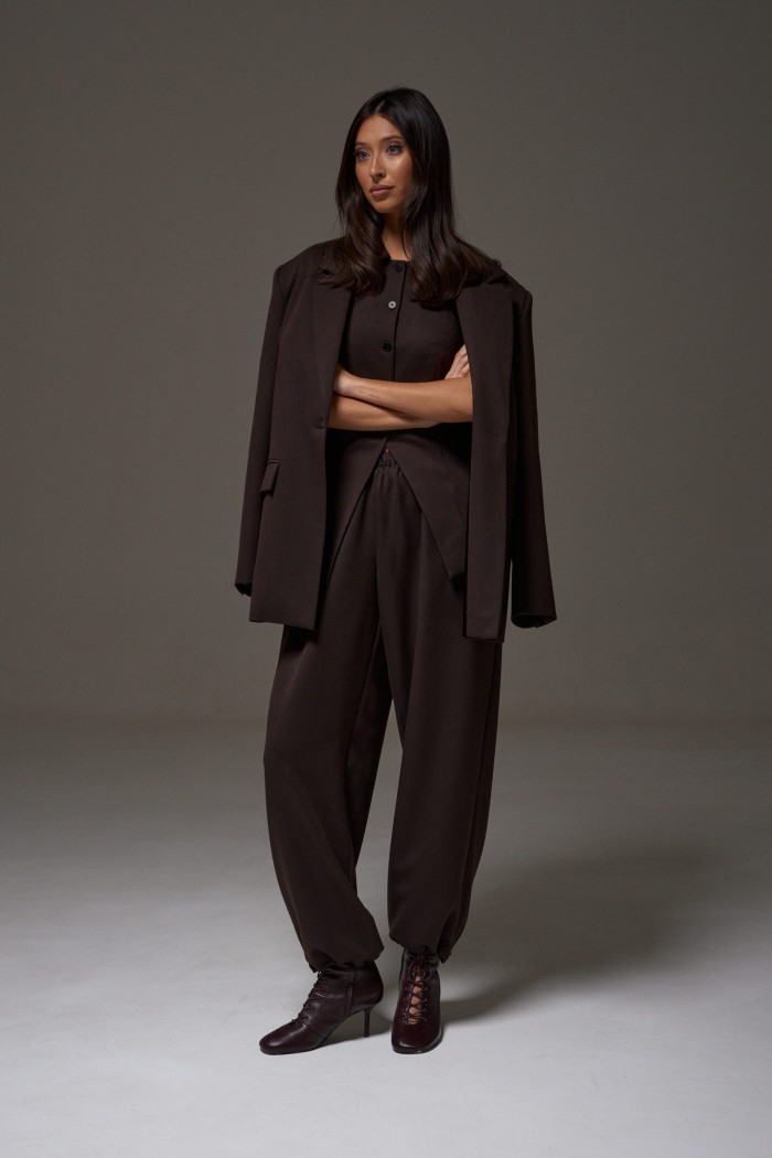 Жакет прямого свободного кроя выполнен из костюмной ткани темно-коричневого цвета. Характеристики: прямой свободный крой, брендированная подкладка, подплечники, воротник с остроугольным лацканом, застежка центральная на петлю - пуговицу, по переду функциональные карманы с клапаном, рукав втачной, по низу рукава нашиты пуговички, спинка со средним швом, в среднем шве разрез 24 см. Длина по спинке 76, длина рукава от линии втачивания 63 см.