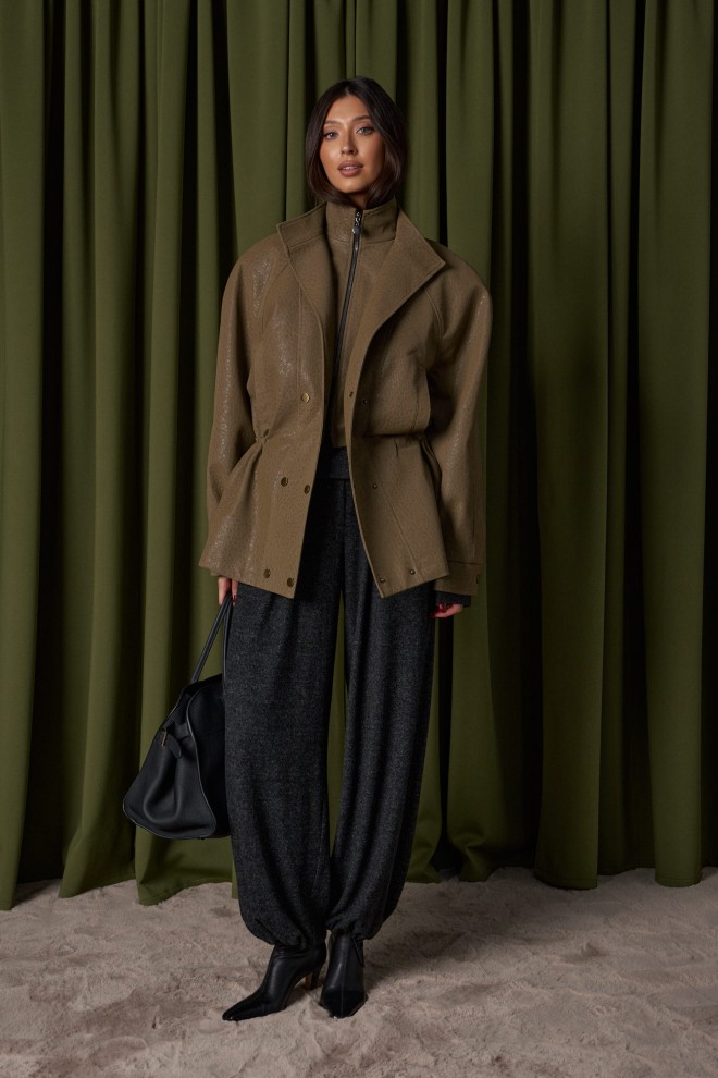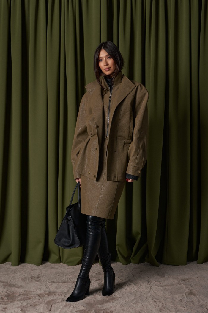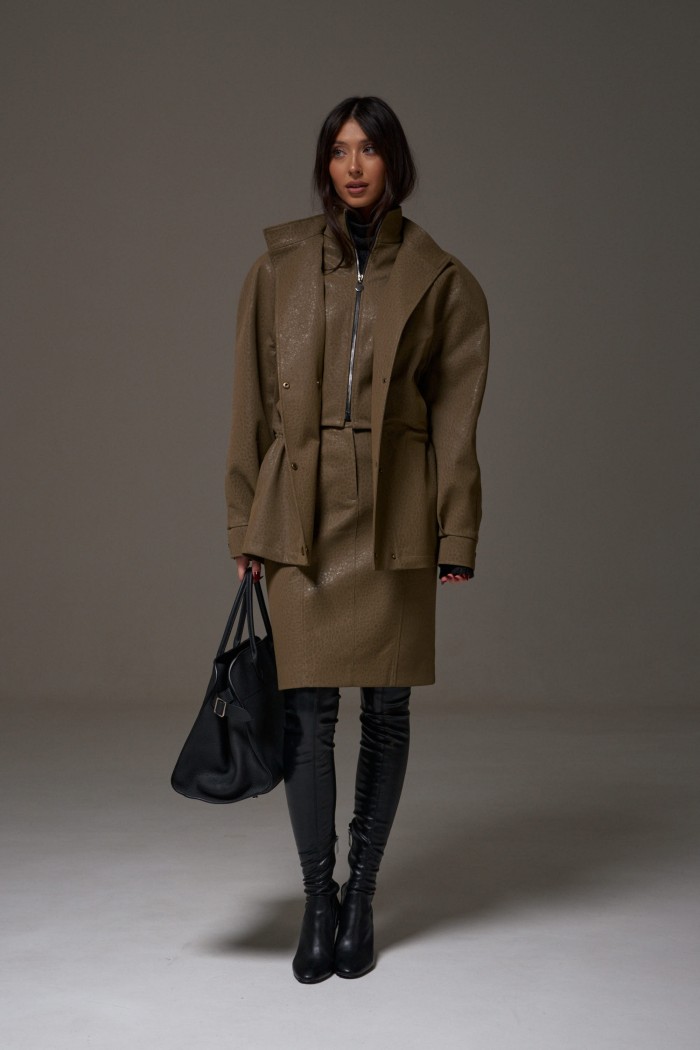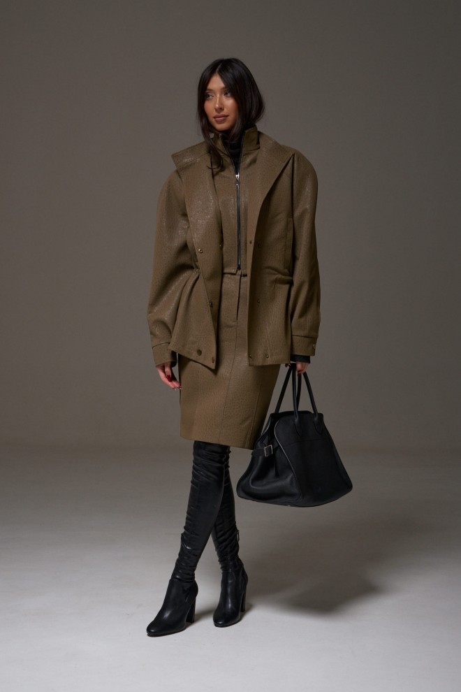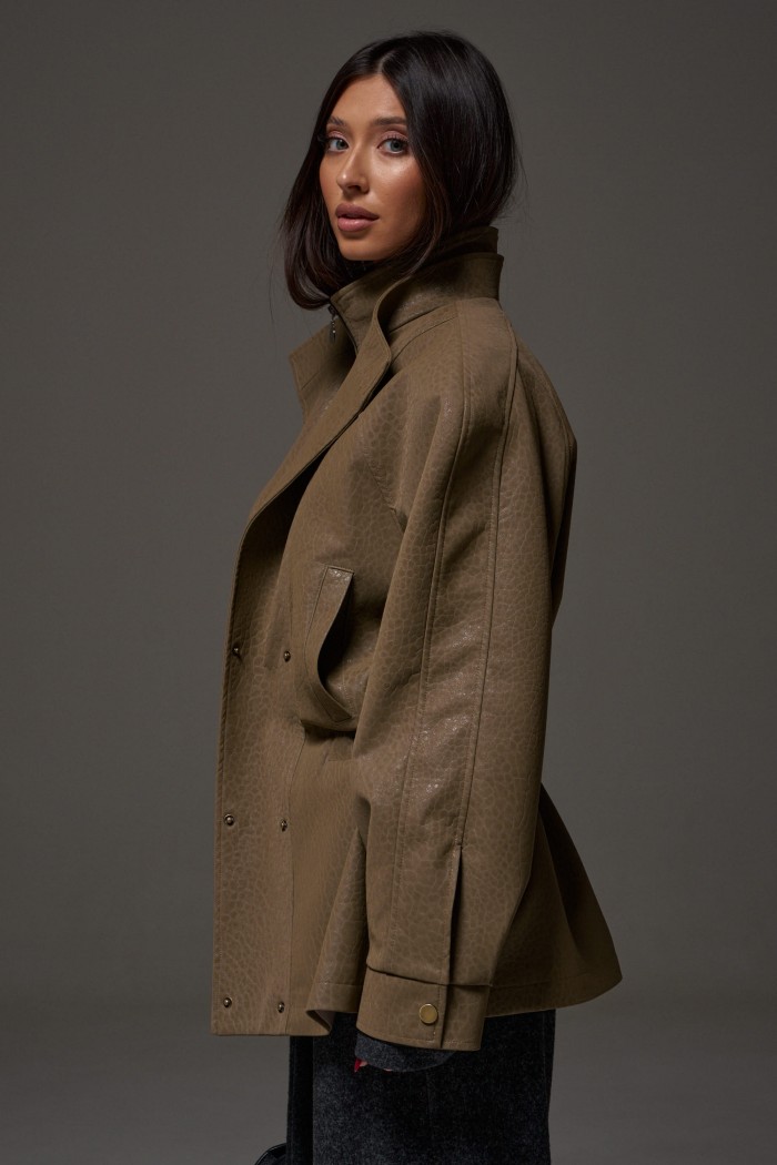 Куртка с акцентной талией, выполнен из эко-кожи цвета хаки. С подкладкой, с утеплителем (утеплитель по переду и по спинке). Характеристика: прямой свободный крой. Пояс изделия на резинке с фиксатором во внутренней части. Брендированная подкладка на утеплении (утеплитель по переду и по спинке, рукава без утеплителя). Горловина стойка, манишка из основной части изделия на молнии. Застежка центральная двубортная на шесть кнопок. Функциональные карманы в части груди. Рукав реглан, центральная часть прошита планкой, низ рукава фиксируется кнопкой. Длина по спинке 72.5 см, длина рукава от края горловины 80см.