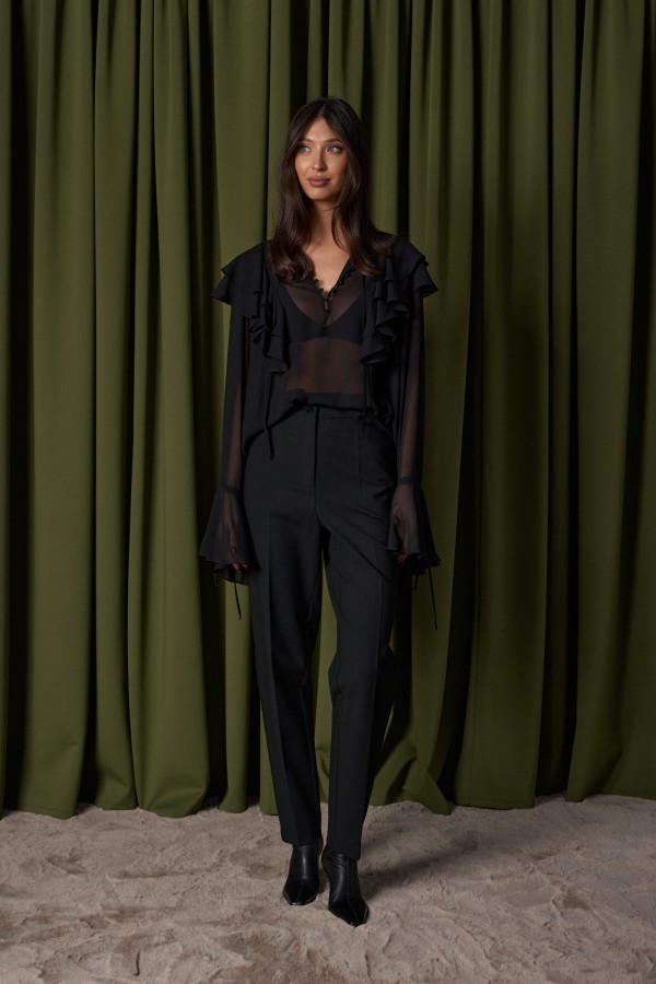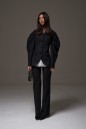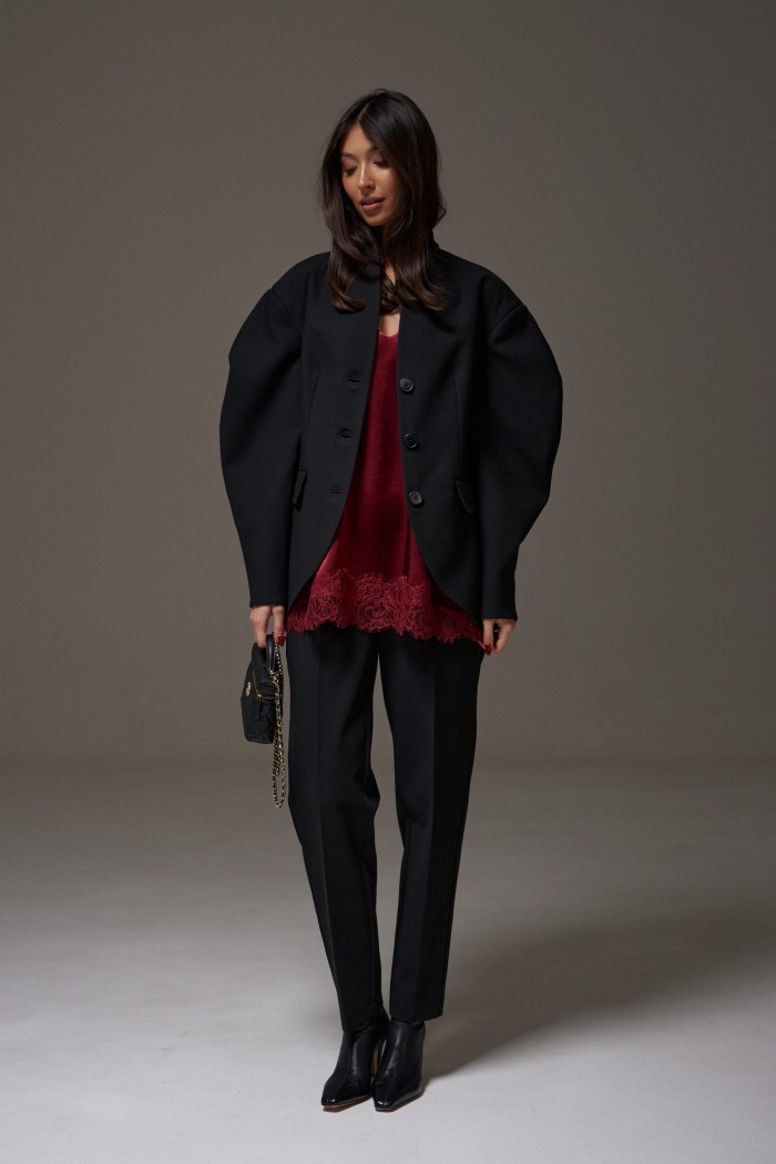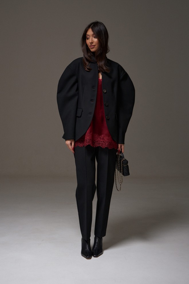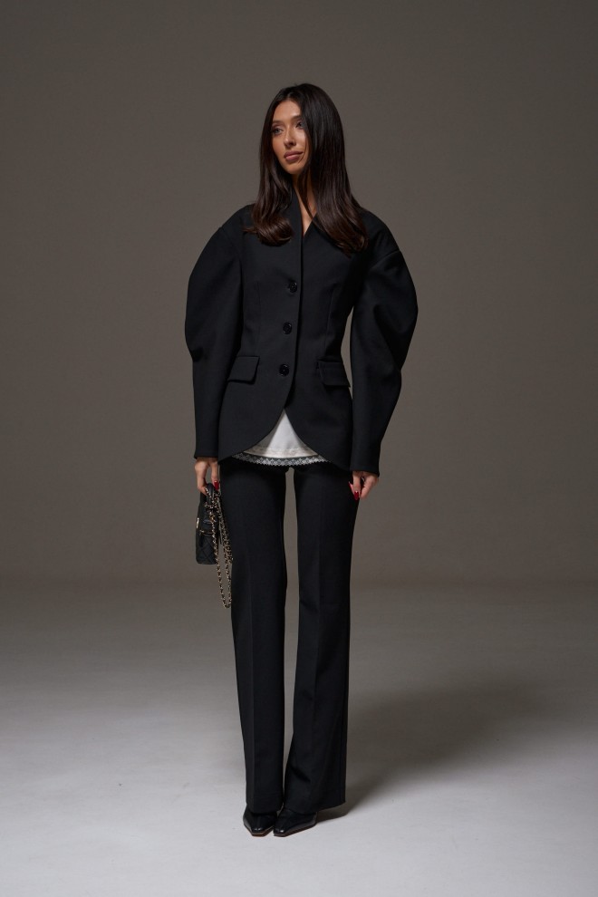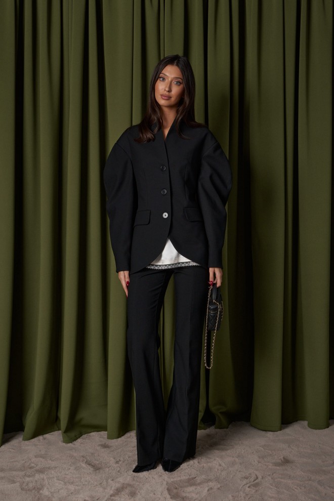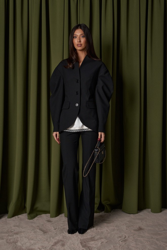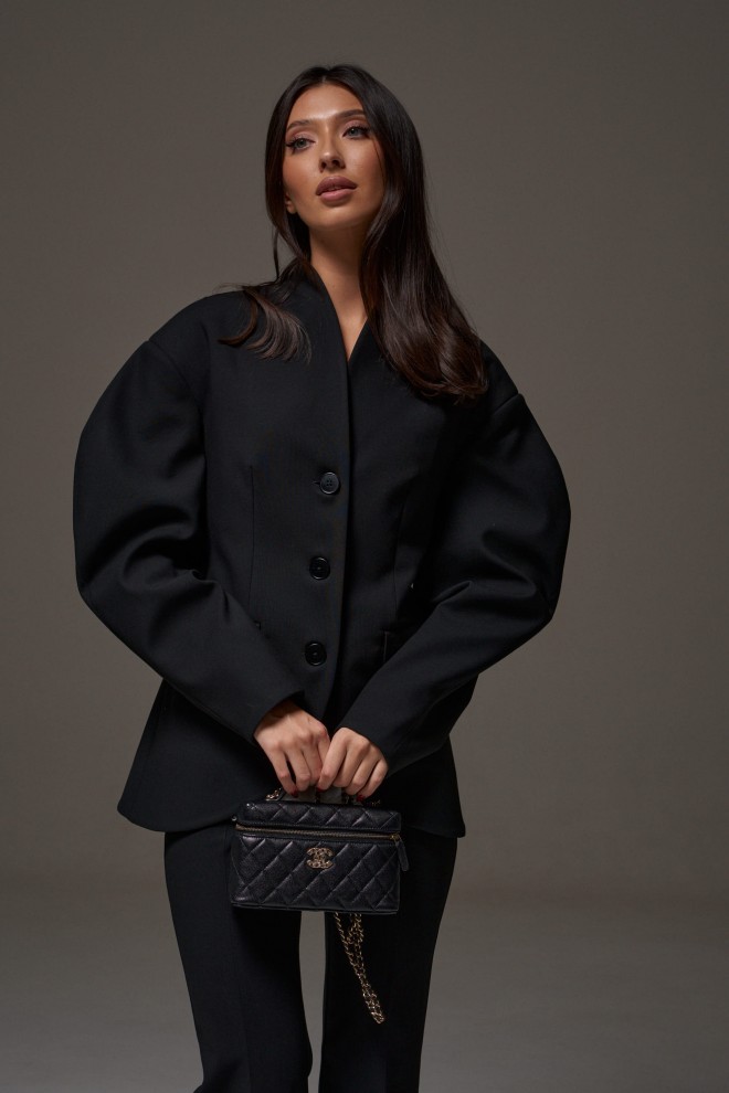 Жакет прилегающего силуэта. Выполнен из костюмный ткани черного цвета. С подкладкой. Воротник-стойка. Вырез горловины V-образный. Рукав втачной, объёмный, заужен к низу. По переду карманы с клапаном. Застёжка центральная - пуговицы. Низ жакета фигурный. Длина спинки 69 см. Длина рукава от линии втачивания 63 см