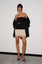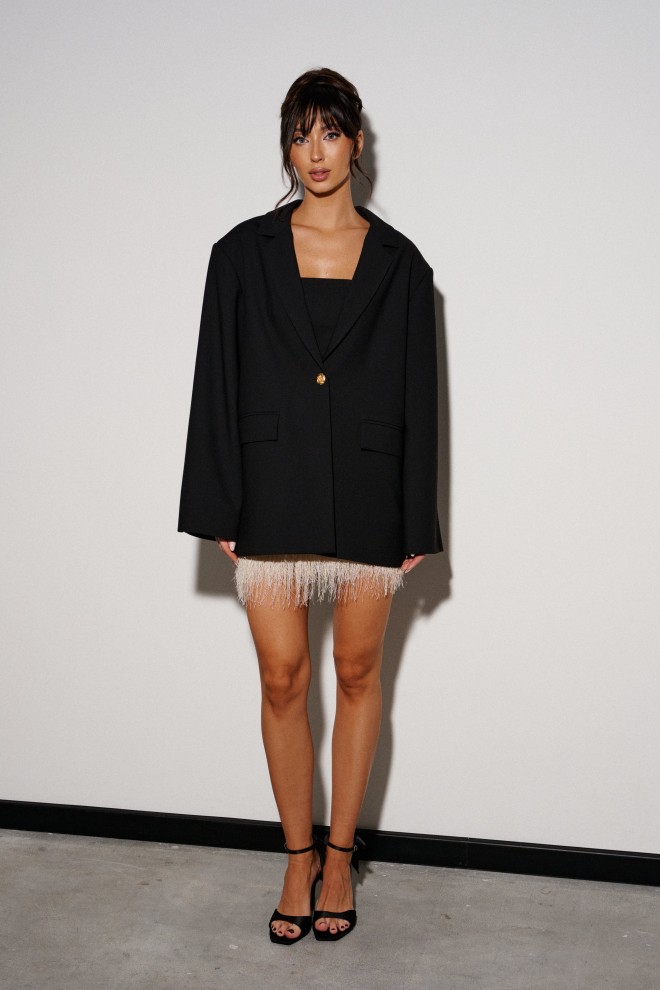 Жакет прямого свободного кроя, выполнен из текстильного полотна черного цвета. Характеристики: широкий прямой крой, отложной воротник с остроугольными лацканами, брендированная подкладка, рукав спущеный прямой, карманы в рамку с клапаном, по низу рукава разрез с крупными декоративными пуговицами, спинка со шлицами (23,5 см )из рельефов, выходящих из плечевого шва. Длина по спинке 77, длина рукава от горловины 84 см.