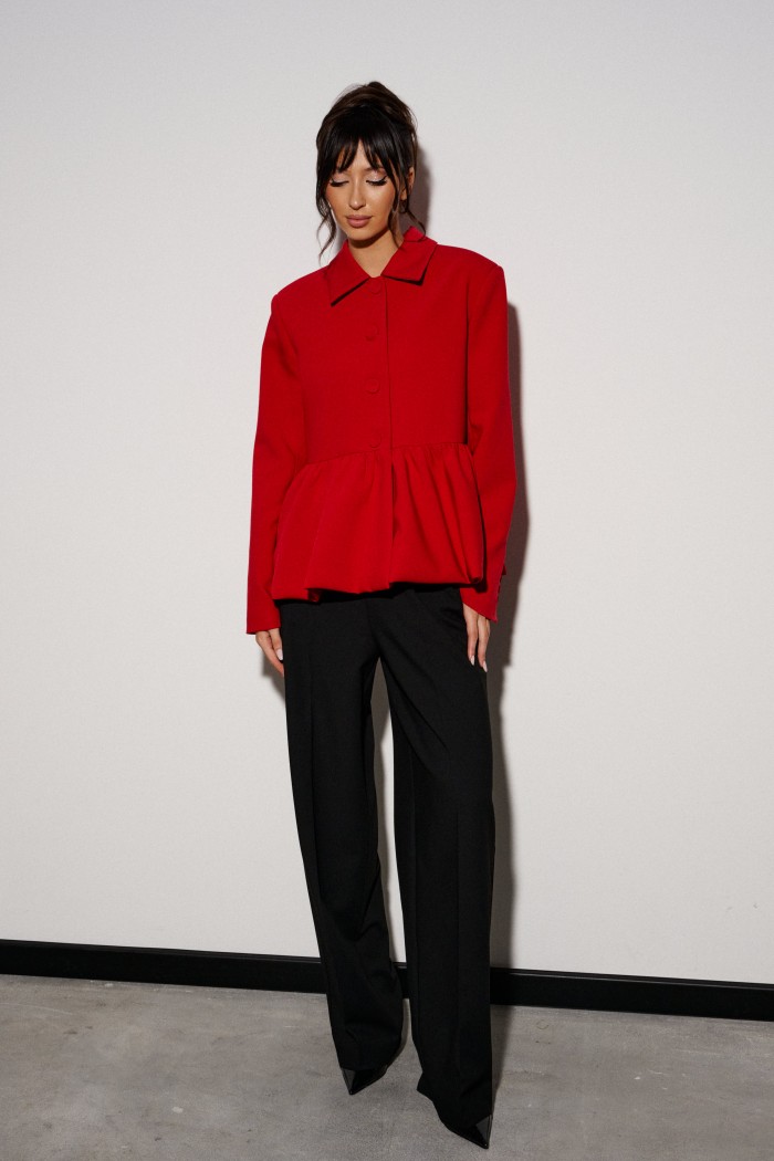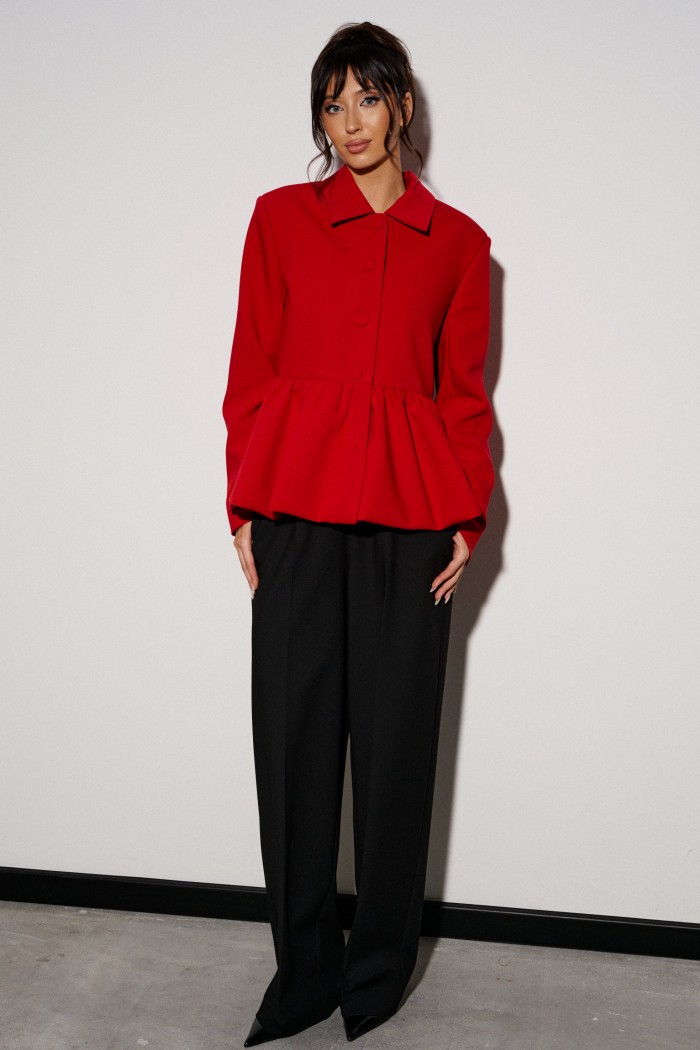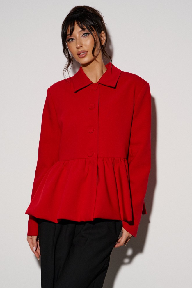 Жакет прямого кроя, с баской по нижней части изделия. Выполнен из костюмной ткани. Характеристики: брендированая подкладка, отложной воротник, застежка центральная на пуговички, рукав втачной. Длина по спинке от края горловины 61 см, длина рукава 83 см.