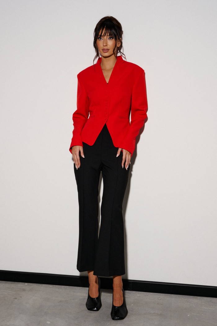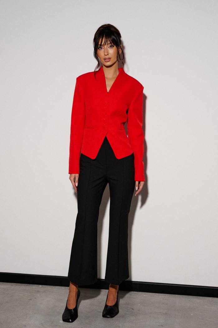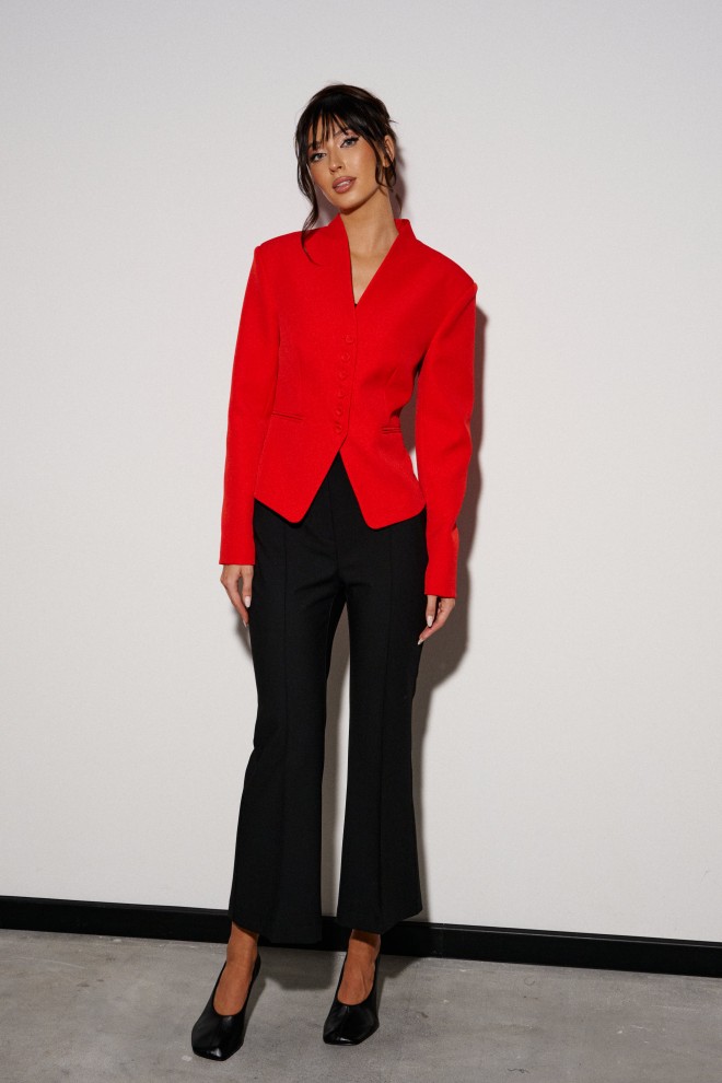 Жакет прилегающего силуэта. Выполнен из костюмной ткани красного цвета. С подкладкой. Воротник-стойка. Вырез горловины V-образный. Рукав втачной. По переду прорезные карманы. Застёжка центральная - пуговицы. Низ жакета фигурный. Длина спинки 52 см. Длина рукава от линии втачивания 62 см