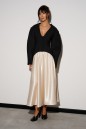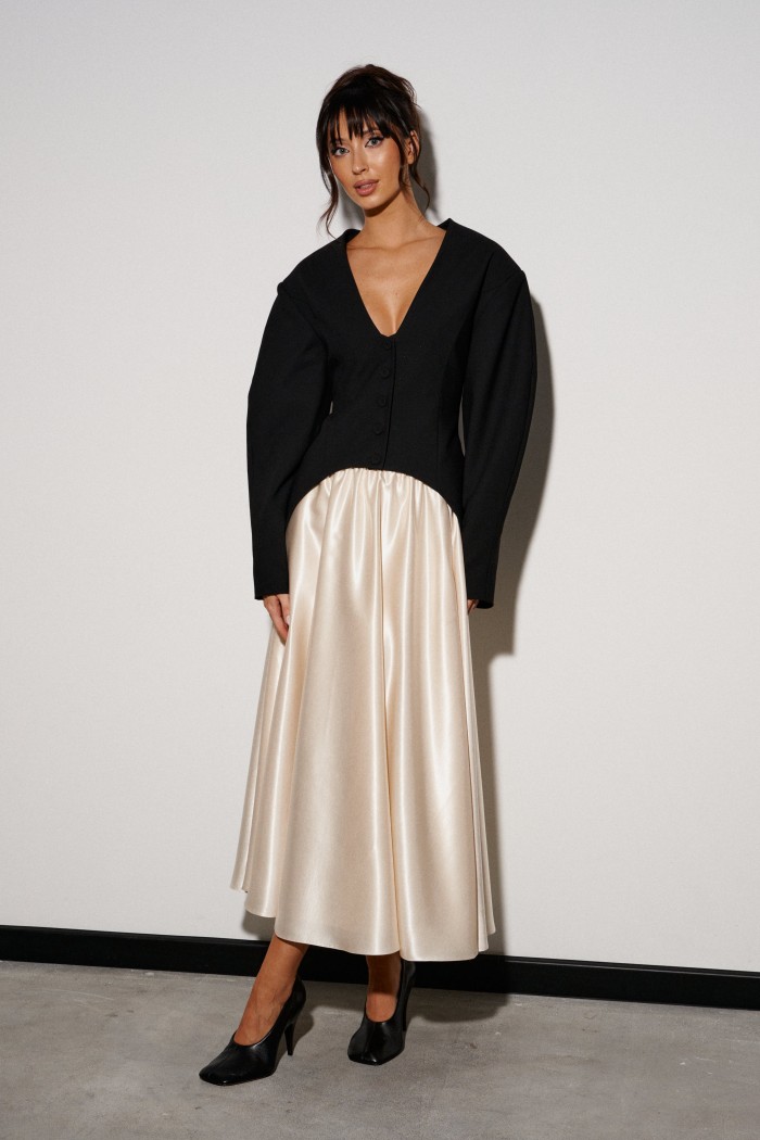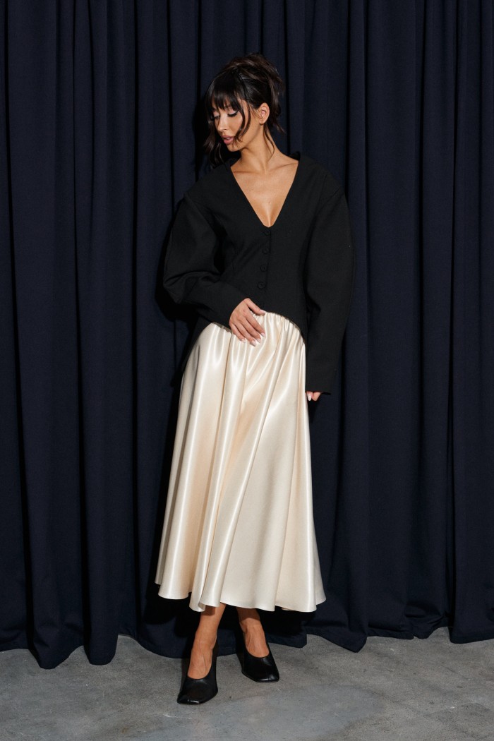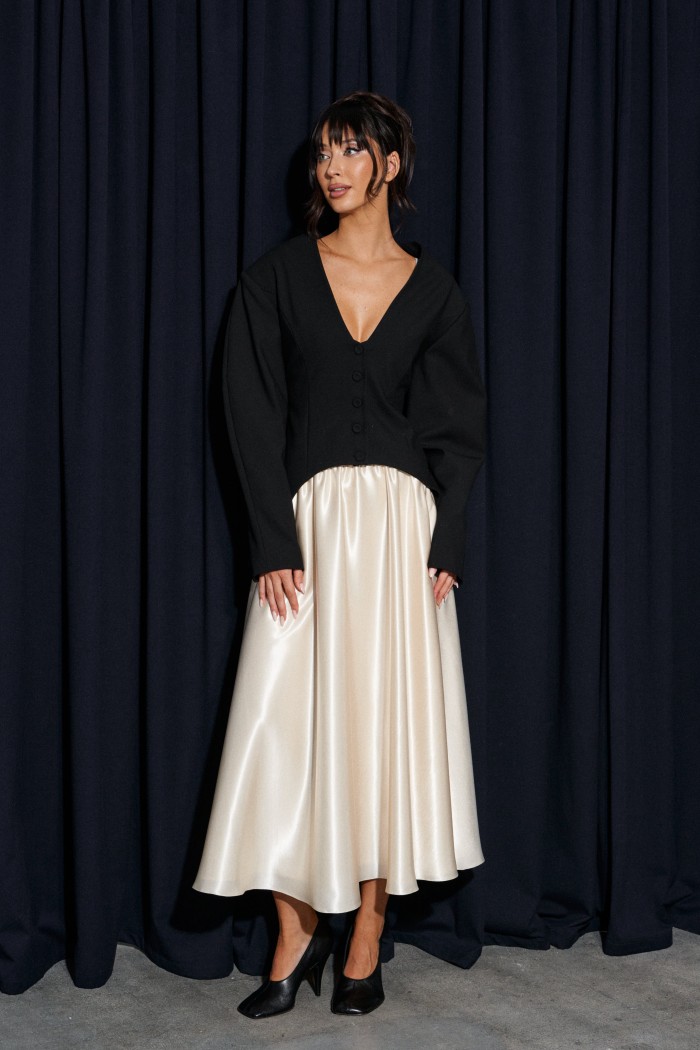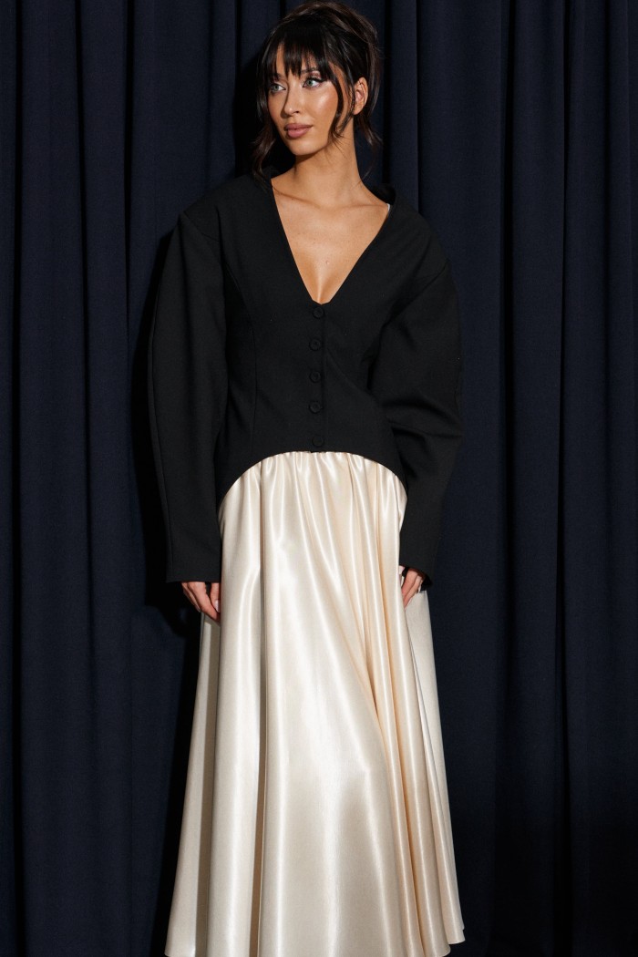 Жакет приталенного силуэта, выполнен из костюмной ткани черного цвета. Характеристика: v-образный вырез, по переду и сзади изедлия простроченные выточки. Застежка центральная на петли - пуговицы. Снизу изделия, плавный срез. Подплечники, рукав втачной, к низу заужен. Брендированная подкладка. По спинке два разреза. Длина спинки по среднему шву 75см., длина рукава от края горловины 80см.