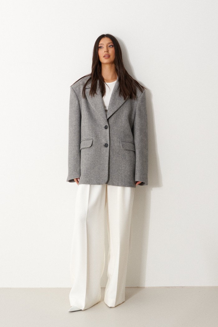 Жакет прямого силуэта, на подкладке. Выполнен из костюмной ткани в елочку в сером оттенке. Характеристика: воротник пиджачного типа, с лацканами. На переде, по линии таллии, обработаны карманы в рамку с клапаном. Спинка со средним швом заканчивающийся шлицей. Рукав втачной двух шовный. Локтевой шов заканчивающийся шлицей застегивающая на петли и пуговицы. Застежка центральная бортовая, застегивающаяся на две петли, пуговицы. Длина рукава 64 см, длина по спинке 75 см.