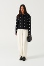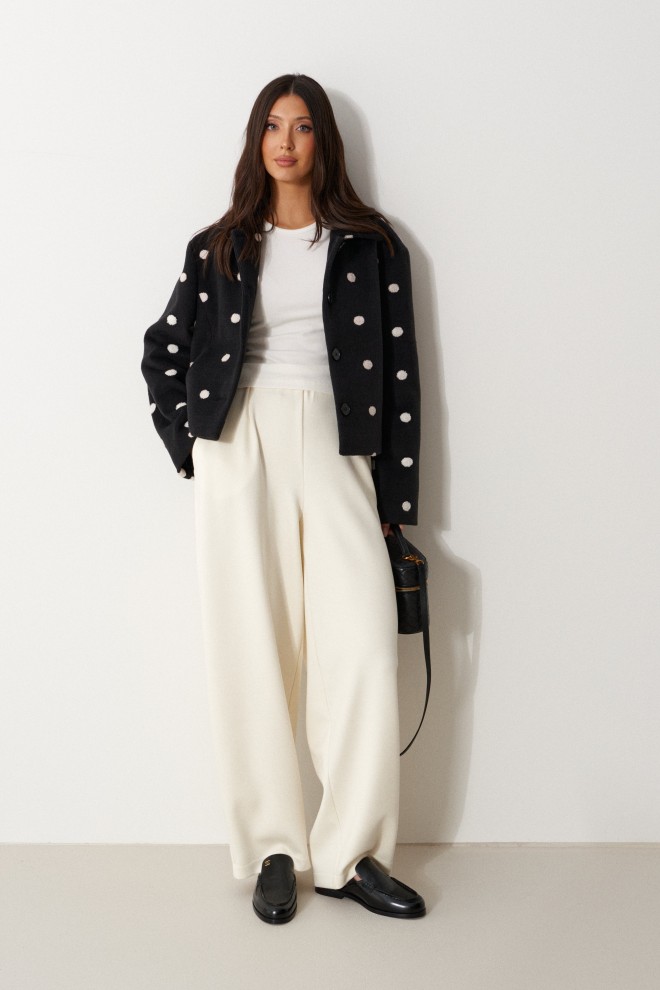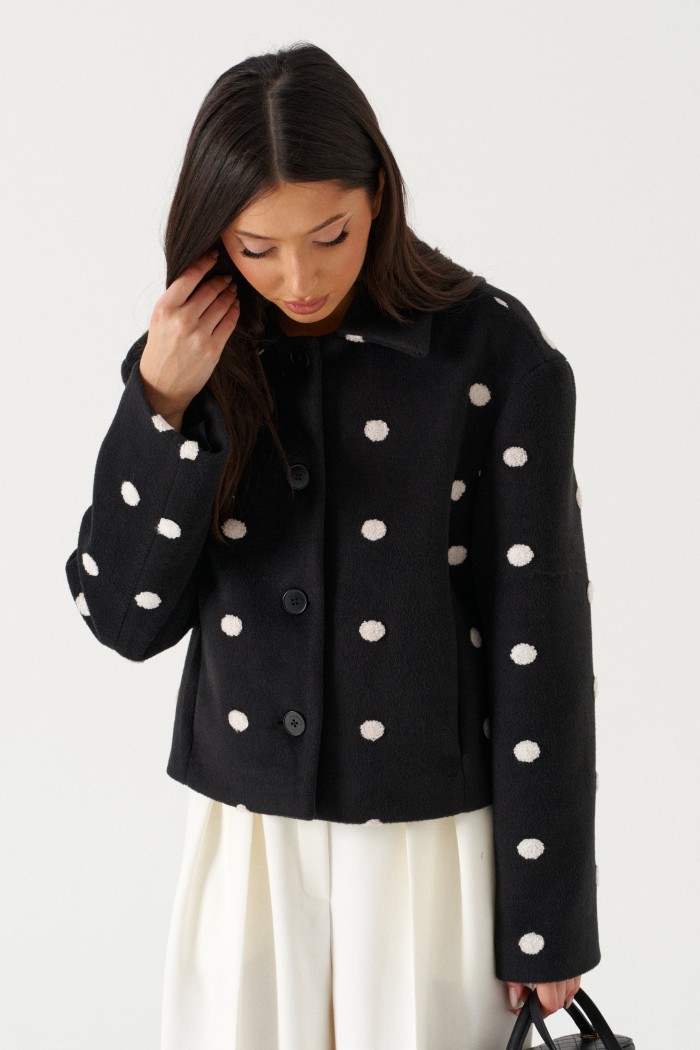 Жакет прямого кроя, выполнен из трикотажного полотна черного цвета в белый горох. Характеристика: прямой крой, отложной воротник, центральная застежка на петли-пуговицы, перед отрезной с вертикальными швами, спинка цельнокраеная, спереди фунуциональные карманы, рукав вточной, плечо спущено. Длина по спинке 54см, длина рукава от края горловины 77см
