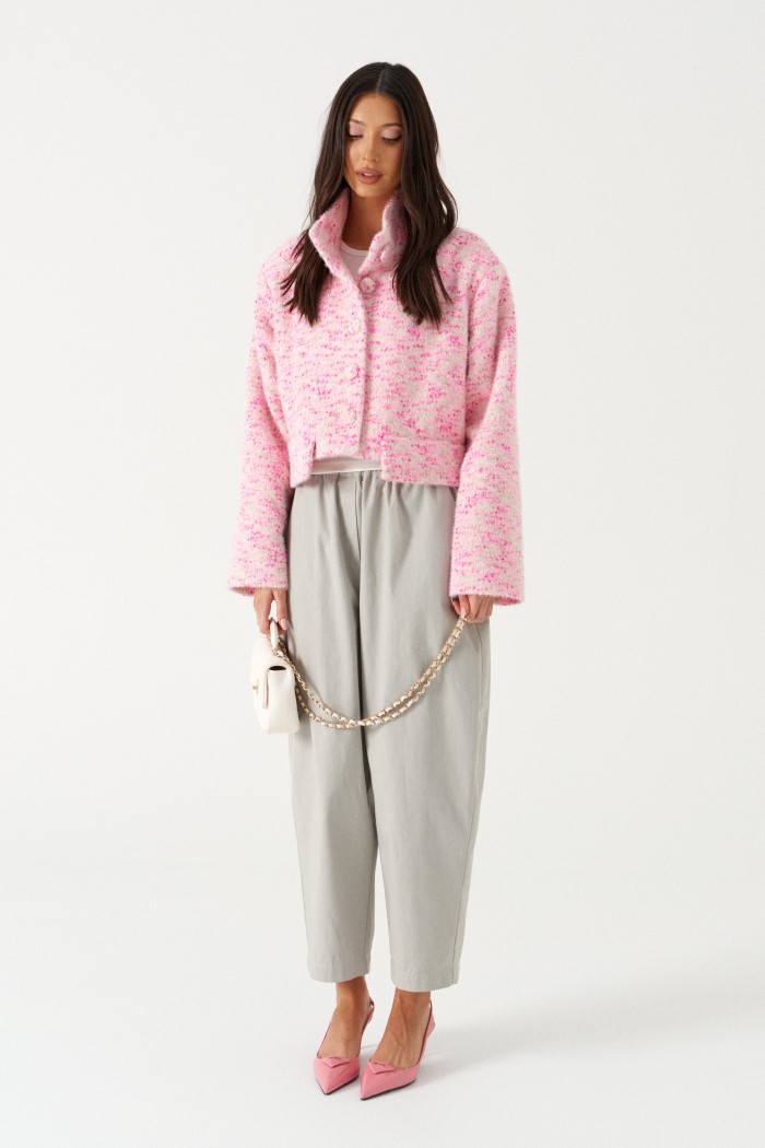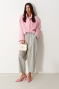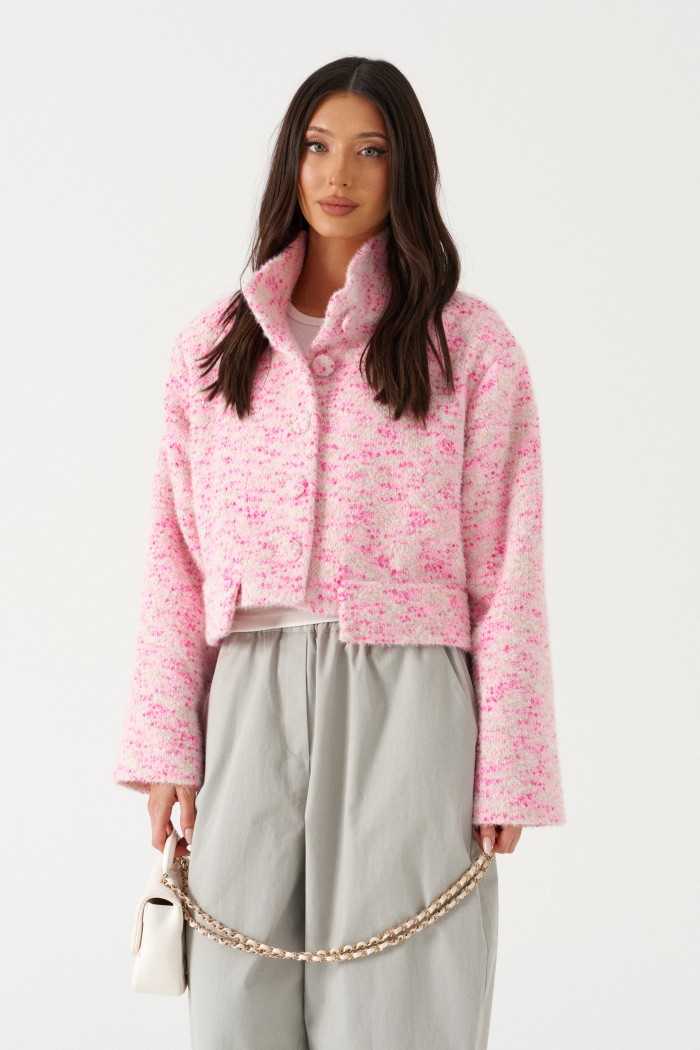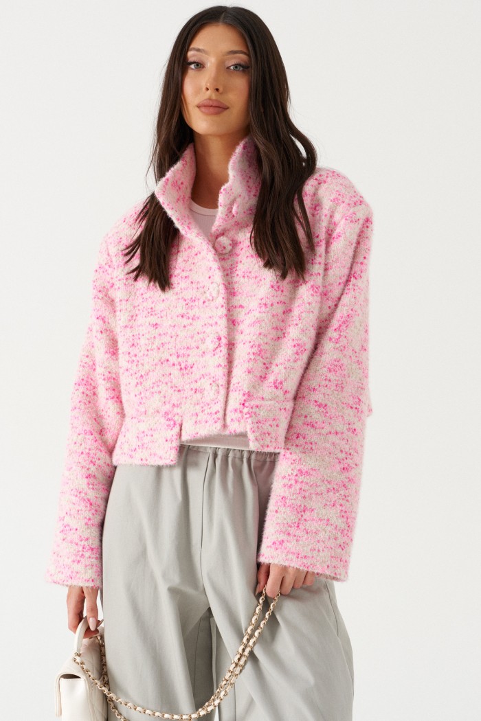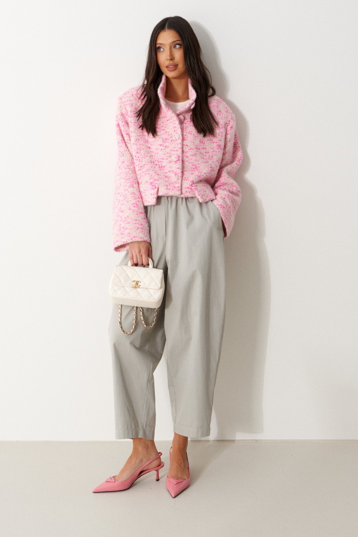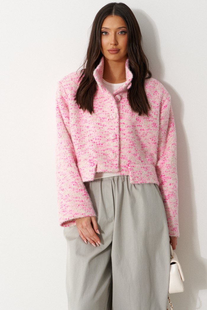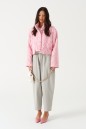 Жакет укороченный прямого кроя, выполнен из трикотажного полотна бежево-розового цвета. Характеристики: на подкладке, горловина-стойка, втачной рукав, линия плеча немного спущена. По деталям полочки настрочные клапаны, выходящие за линию низа.