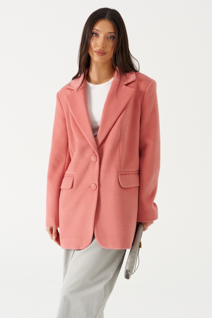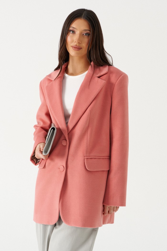 Жакет прямого свободного кроя. Выполнено из пальтовой ворсовой ткани нежного розового цвета. Характеристика: брендтрованная подкладка, воротник отложной с лацканами, рукав втачной и чуть спущен, по переду карманы с клапанами, застёжка центральная - пуговицы, в среднем шве заднего полотна шлица (29,5 см). В комплекте пояс из ткани основного изделия. В комплекте идет пояс из основной ткани изделия. Длина спинки 78 см. Длина рукава от линии втачивания 62 см